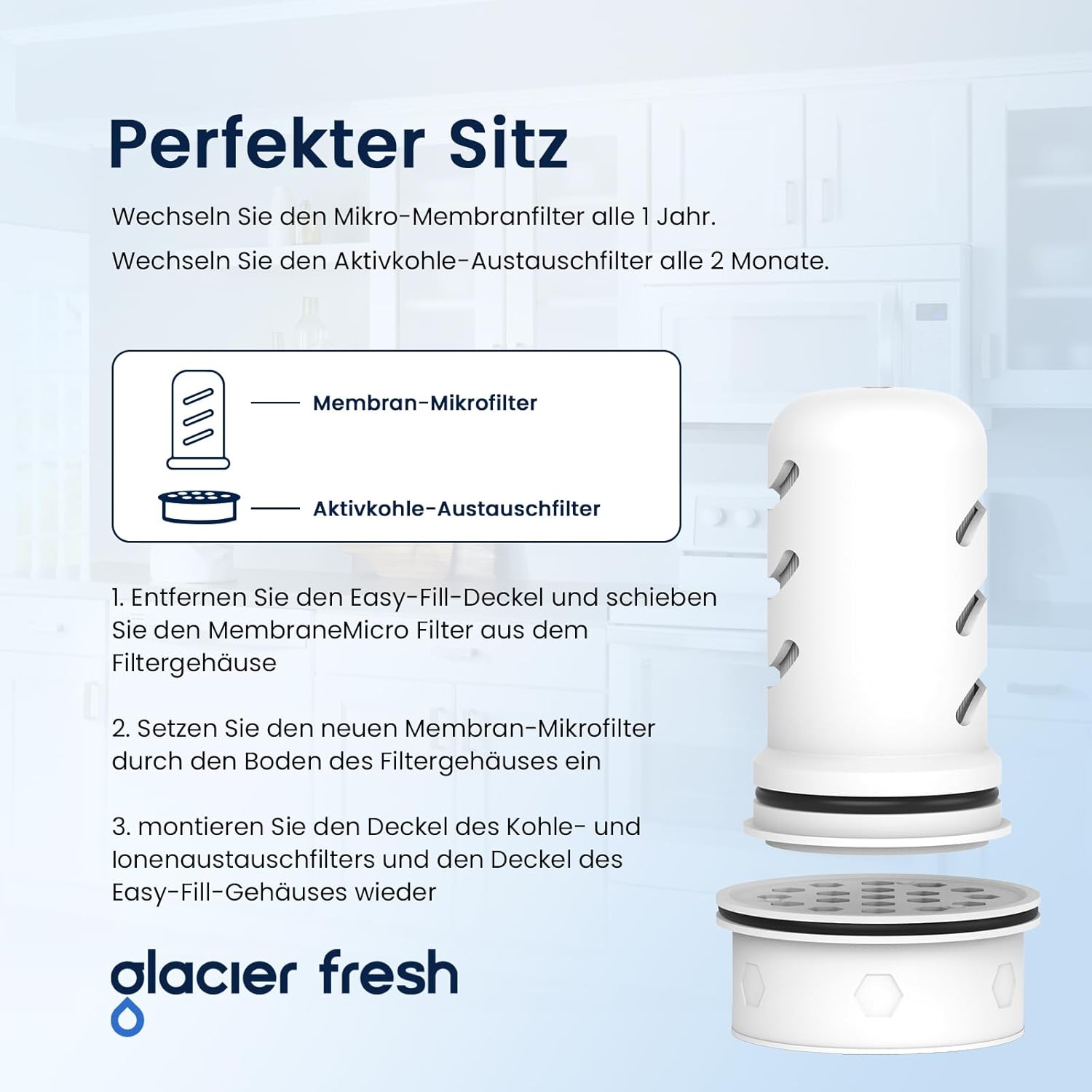 - Long-lasting filter lifespan: Remember Changing your water filter regularly ensures that you have clear, refreshing, healthier, great-tasting water. Please replace Activate Carbon exchange filter after 150 liters or 2 months. Replace Membrane Micro filter every 264 gallons or 6-12 months, depending on your water usage, whichever comes first. To ensure you have healthier and great-tasting water, GLACIER FRESH recommend you change it every 6 months.