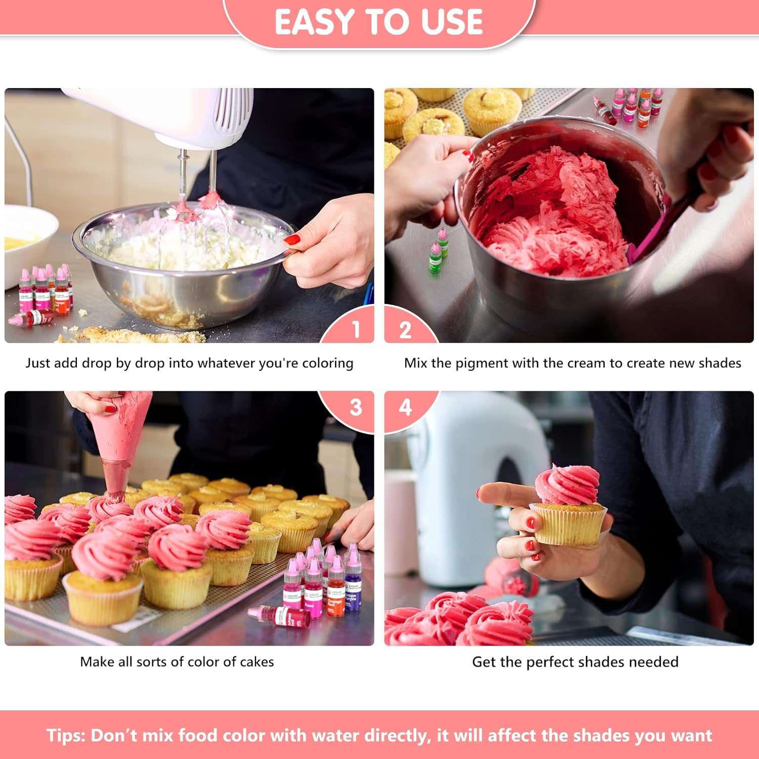 - Multi-uses Liquid Based Food Coloring Set - Includes vibrant neon 20 edible food colors. Liquid food coloring for cake decorating is easy to mix and disperse shades, easter eggs dye kit perfect for cake decorating, macaron, candy, icing cream, cookies, fondant, slime making and crafts DIY, etc.(Tips: Please do not mix food coloring with water to use, it will affect the shades you want)