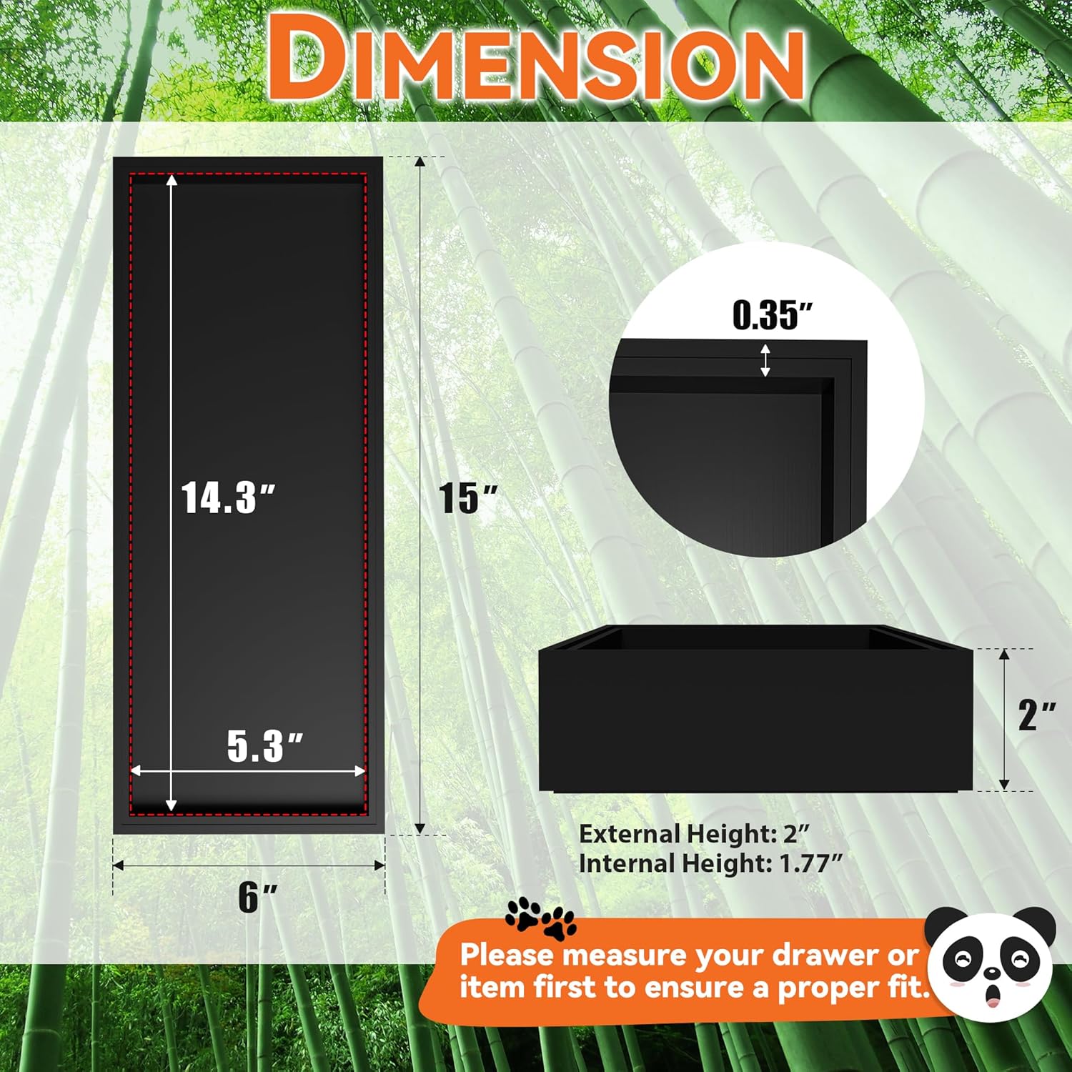- Each bamboo drawer organizer measures: external size: 15" L x 6" W x 2" H; internal size: 14.3" L x 5.3" W x 1.77" H. Please check the size before purchasing
