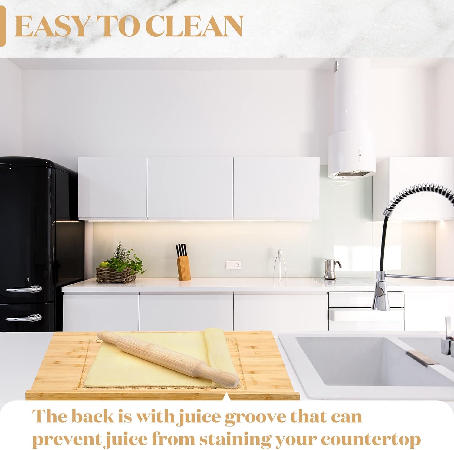 - Extra Large Size: the wooden pastry board for rolling dough measures approx. 24 x 22.8 x 1.5 inch, and it feathers with 2 in 1 design, one side is smooth for kneading or rolling dough, the other side can act as cutting board, maximize utilization to save your kitchen space, and make your kitchen more tidy and orderly