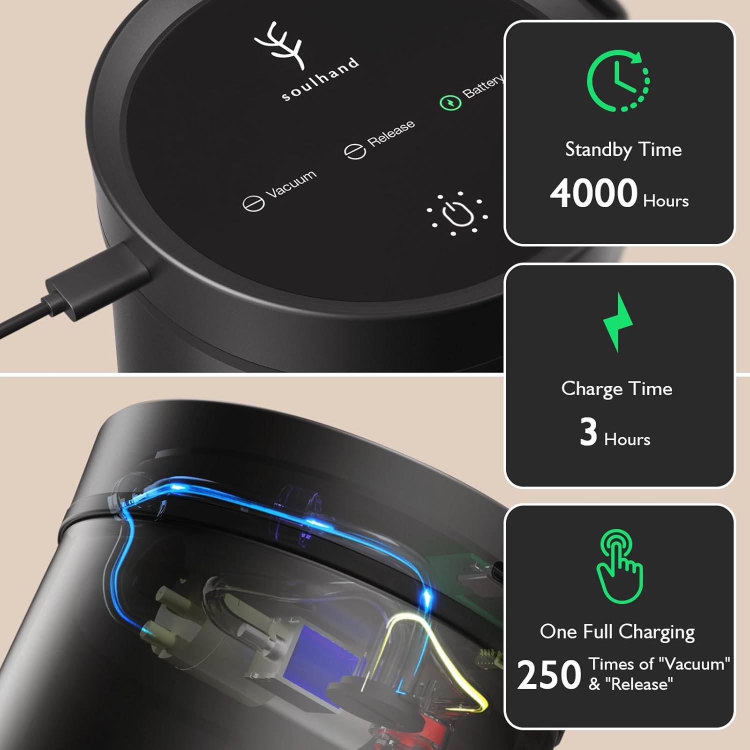 - SMART & SUPER-LONG STANDBY: No manual twisting or pressing is needed to activate the vacuum seal! Our coffee canister can remove air by tapping the top of the lid. It fully charges in 3 hours and can continuously turn on and off 300 times and last for 6 months. Soulhand coffee storage container's unique automatic sealing system will constantly monitor the air pressure inside the container and automatic air exhaust. (NOTE: Use the charging cable that comes with the coffee canister).