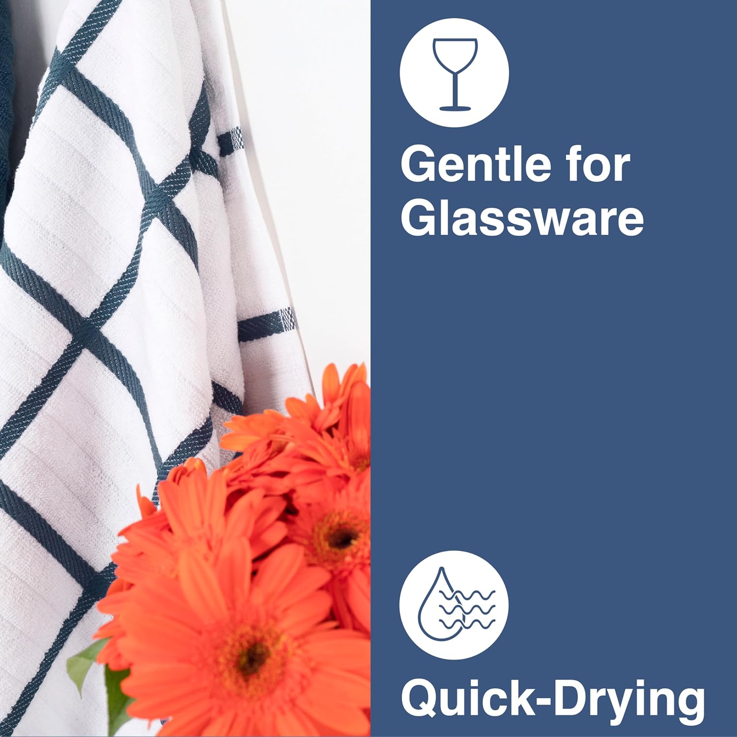 - 100% COMBED COTTON. Extra soft pre-washed, yarn-dyed cotton with finished stitched hems. Made of highly absorbent soft cotton that makes them great for drying dishes and glassware and cleaning up spills around the kitchen