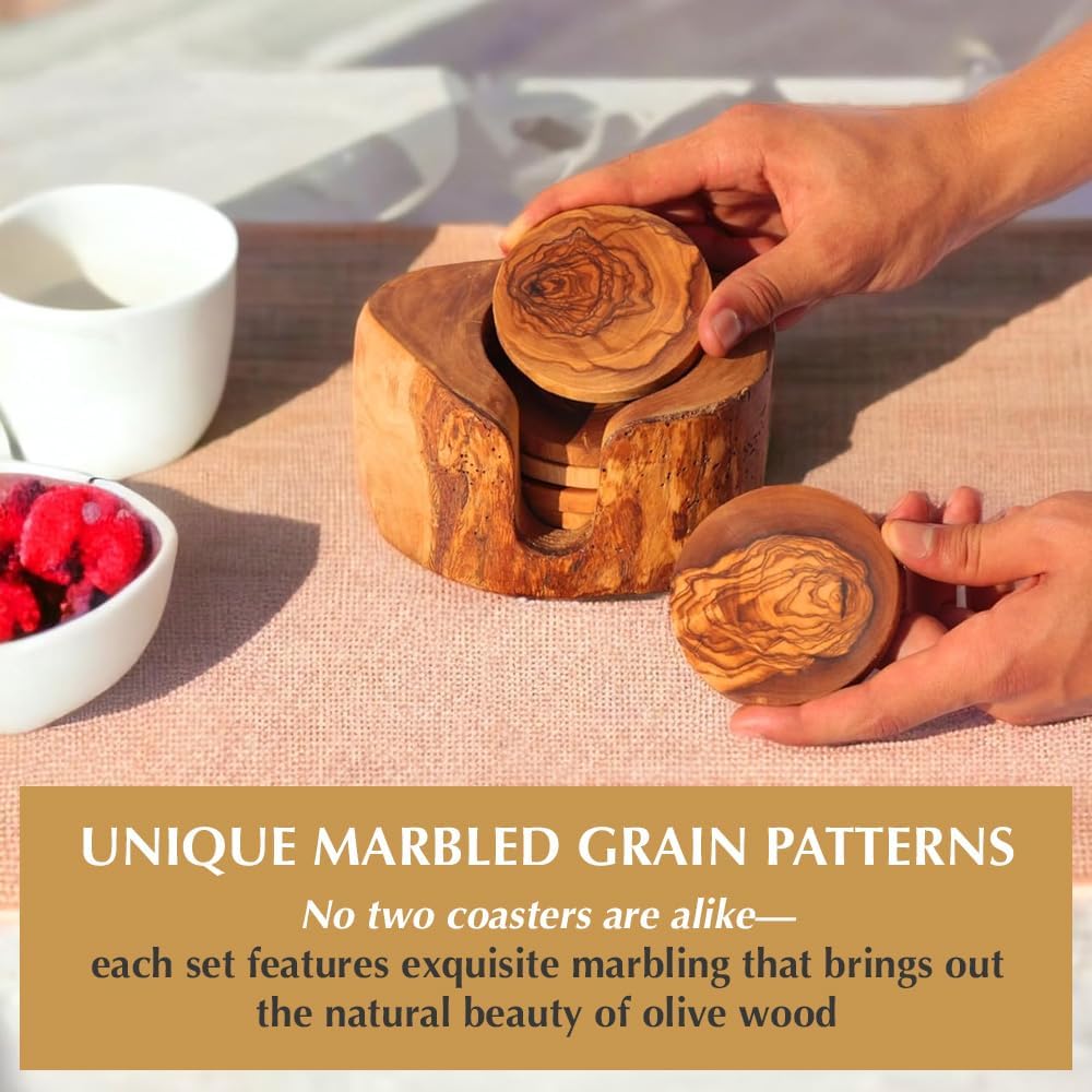 - DURABLE AND LONG-LASTING PROTECTION — Made from dense and durable olive wood, these rustic coasters are designed to last. Naturally resistant to moisture and heat, the table coasters for drinks offer reliable protection for your tables and countertops. Whether you're serving hot coffee or cold drinks, these round wood coasters keep your surfaces stain-free. Easy to follow care instructions are included.