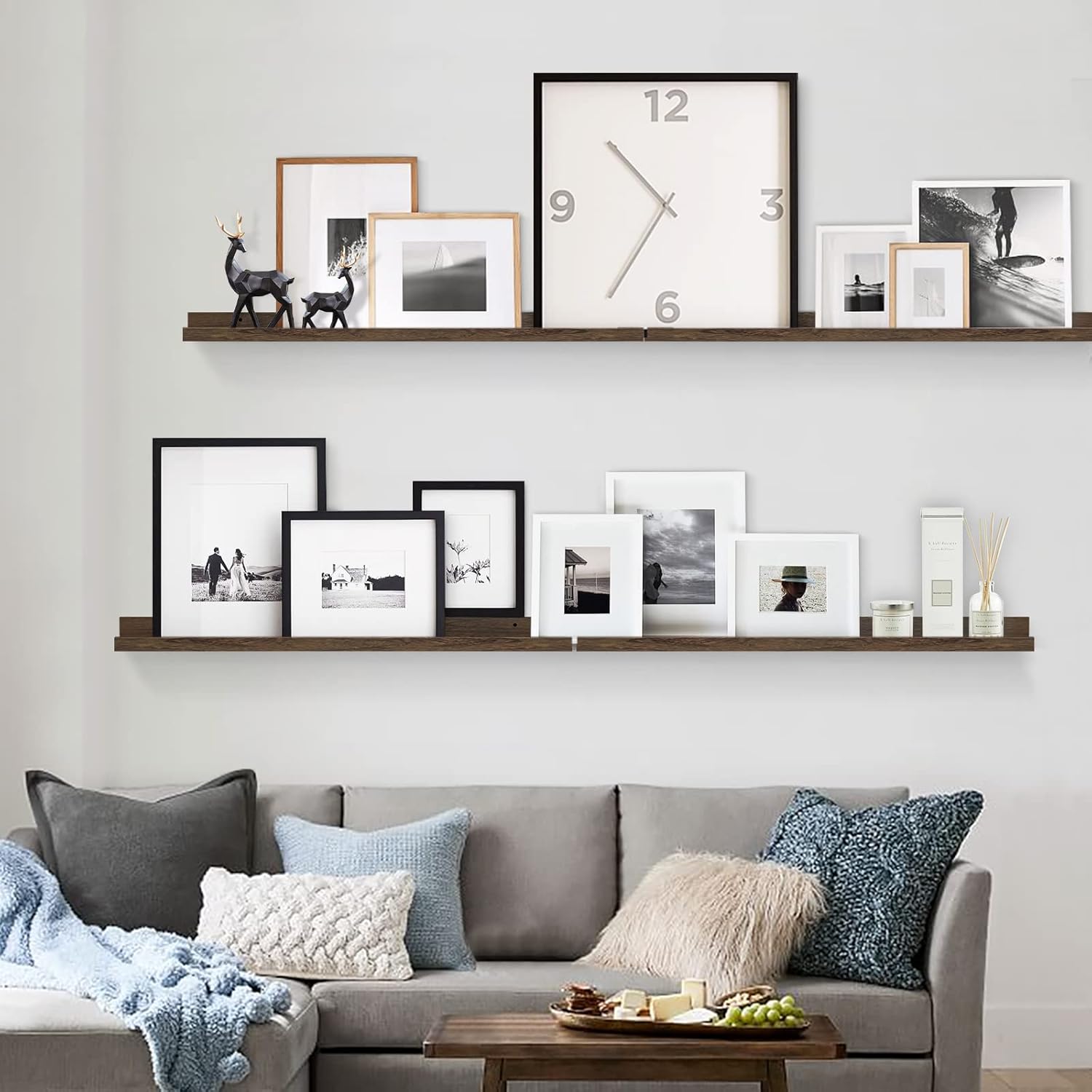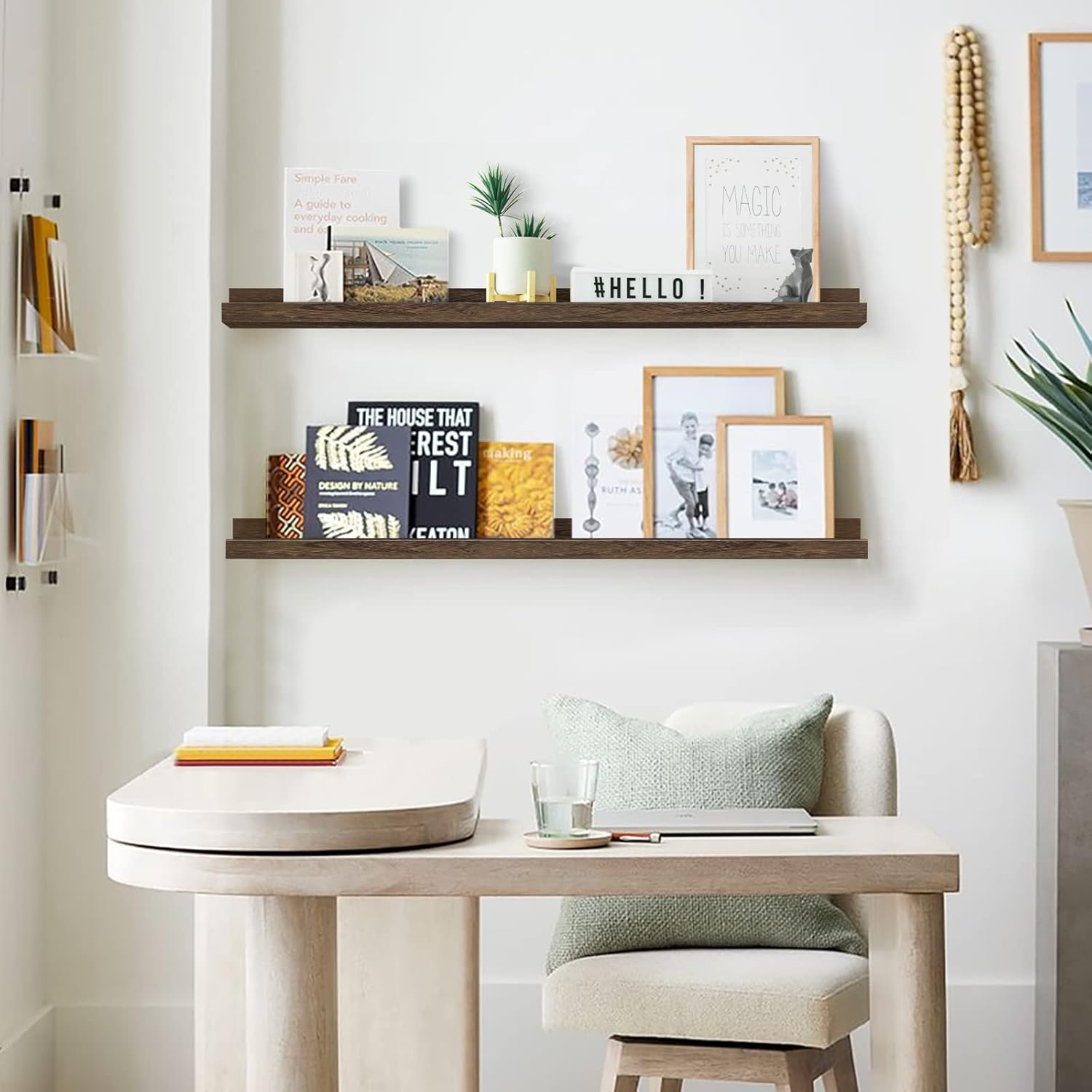 - 【Suitable for All Occasions】The sleek, simple design of wall photo ledge shelves allow them to match with nearly any aesthetic. The wooden picture shelf can help to declutter or free up counter space in your kitchen and office to make places much tidier and neater - from keeping seasoning, spices bottles and wine glasses in a kitchen area to organizing hand towels, toiletries, essential oil in a bathroom.