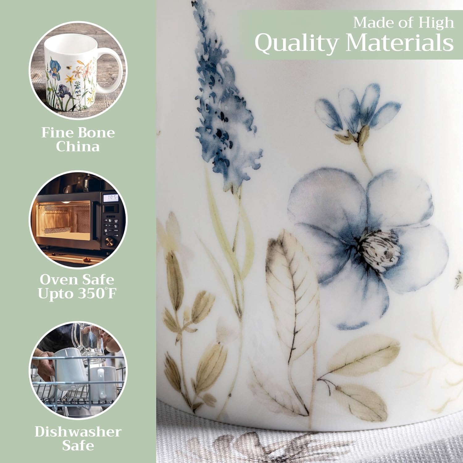 - Easy Care & Maintenance: Microwave, dishwasher, and oven safe up to 350°F. These bone china mugs are built for convenience and durability, making cleanup and reheating simple without compromising on quality