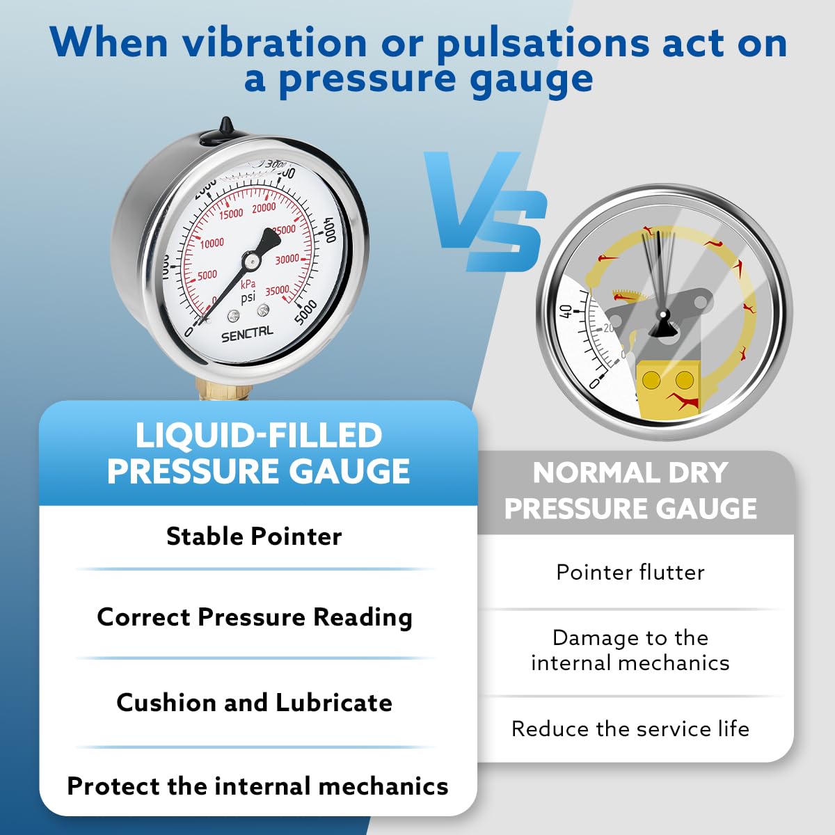 SENCTRL 5000 Psi Glycerin Liquid Filled Hydraulic High Pressure Gauge, 2.5" Dial Size, 1/4" NPT Lower Mount, Stainless Steel Case, for Air Gas Water Oil Pressure Test