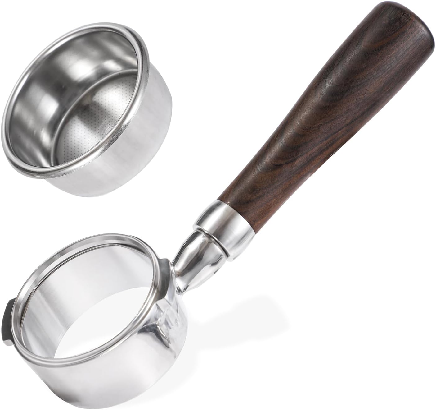 - 【DETACHABLE DESIGN】: The 58mm bottomless portafilter can be fully disassembled to thorough clean and storage. An double cup filter basket is included and, because the interior side-wall is machined flush, the Bottomless Portafilter is compatible with any depth 58 mm basket.(Note: Do not wash the bottomless portafilter in the dishwasher. Because high temperature will discolor the wood.)