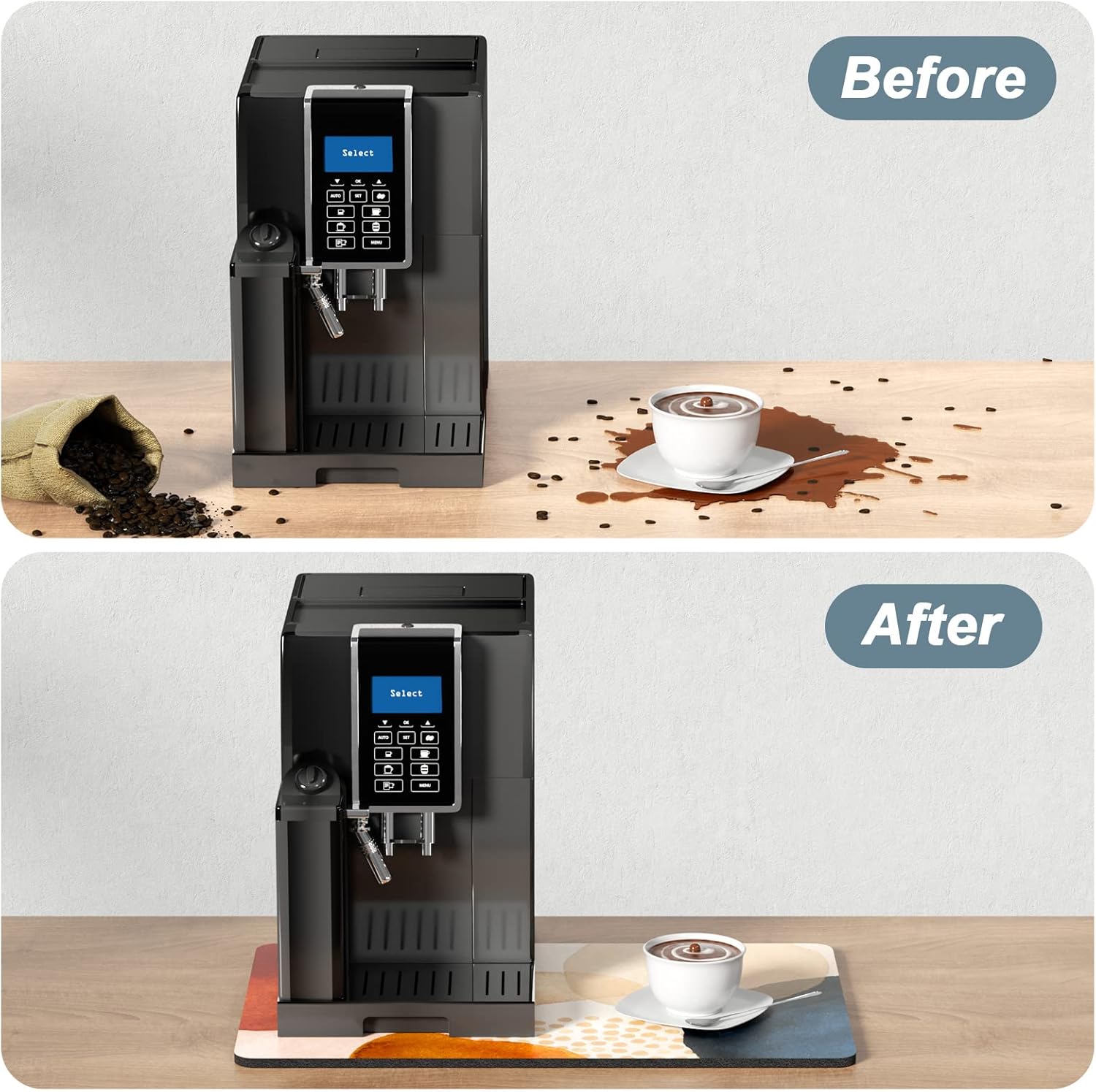 - Personalized Coffee Mat: Coffee bar mat with unique design, elegant yet simplistic, goes well with any style of tables and coffee corners. Add this coffee maker mat to your home to keep the countertop clean and add a little touch of art to your lifestyle