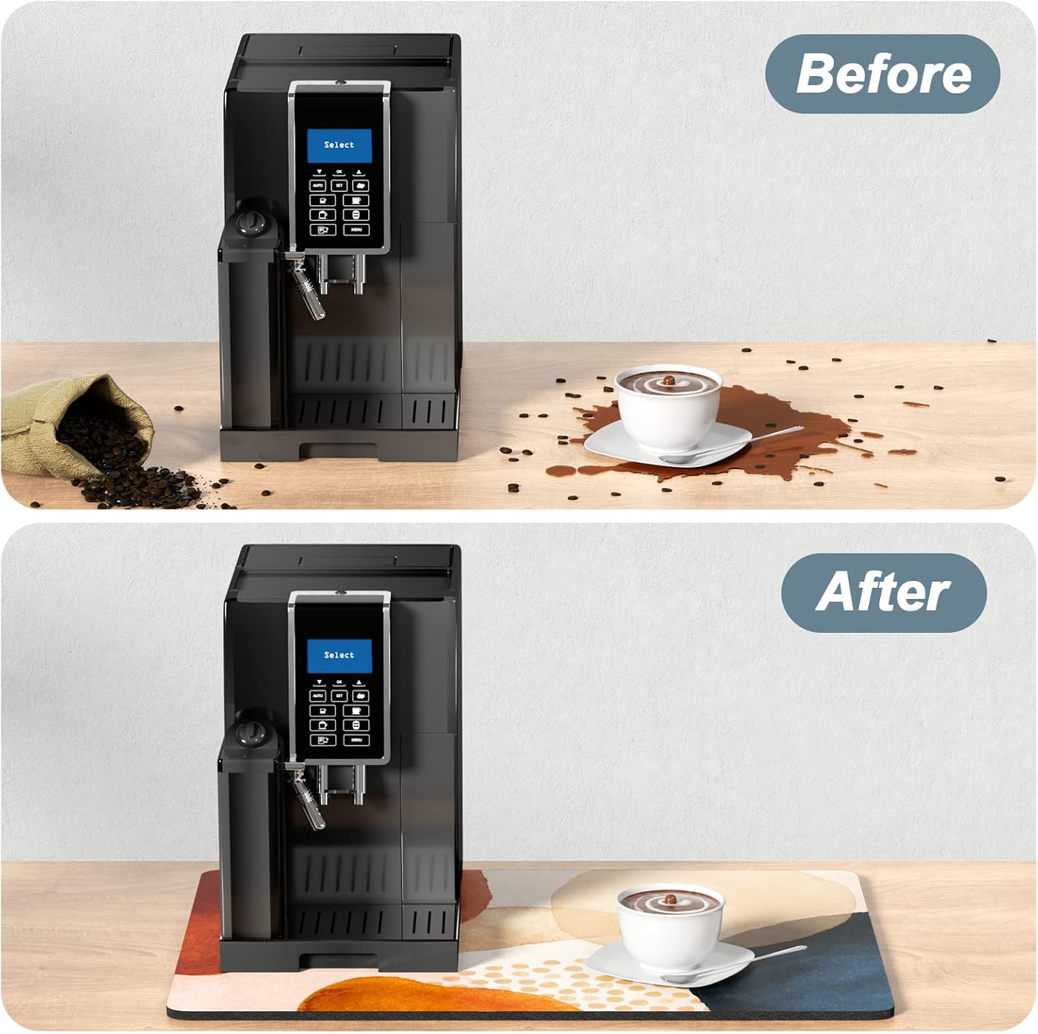 - Easy to Clean: The coffee bar mats for countertop can be cleaned with hand or machine to remove stains, up to 91% porosity material allows coffee bar mats to dry quickly without a machine