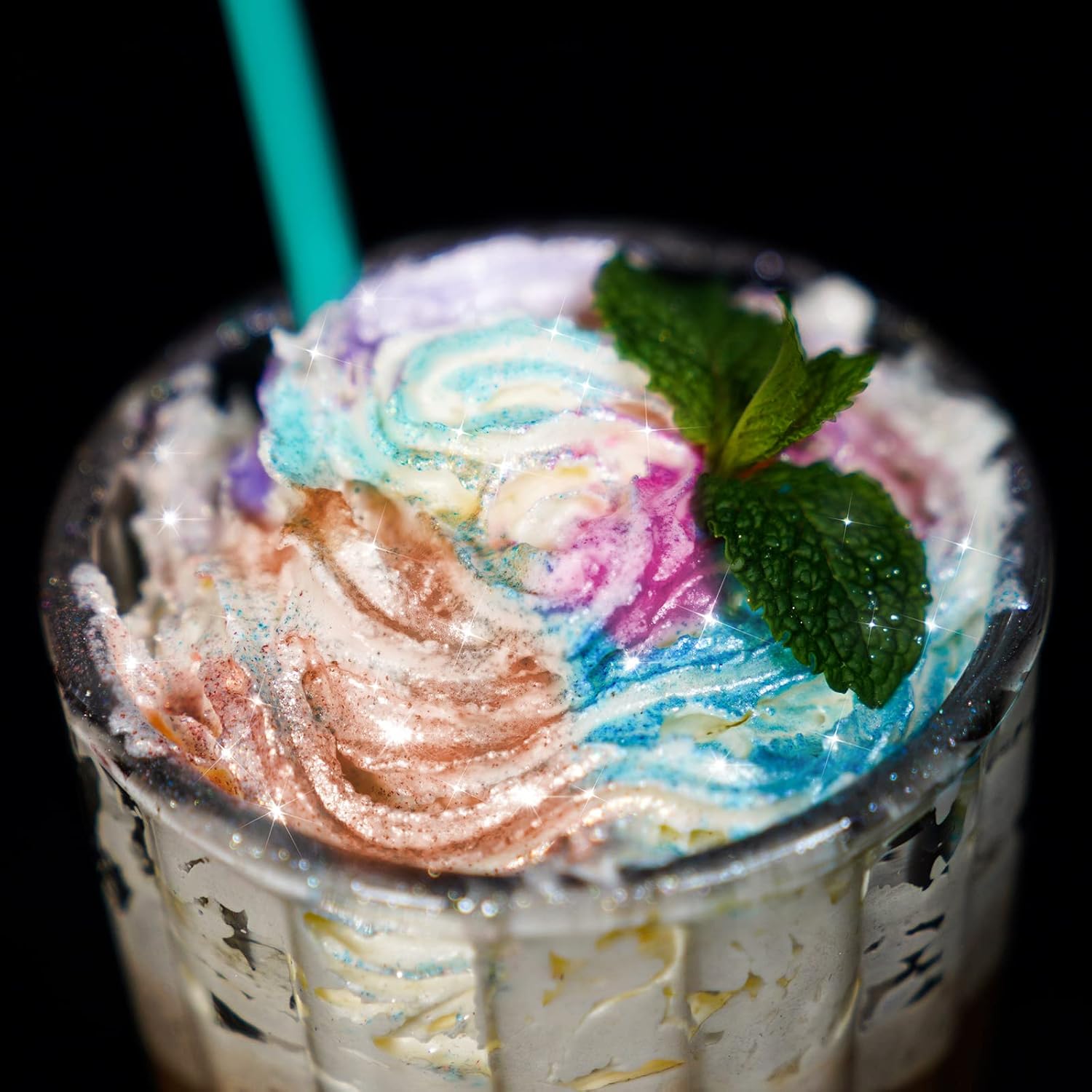 - ✔️【Use with Brews】Food-grade glitters are so fun and simple to use with brews. Add one pinch or two directly to your favorite beverage, mix it with cocktail syrups, juices, liqueurs, liquors, or spirits. Use a clear glass instead of opaque containers so that the liquid looks so cool, especially when you move it around in the glass with a stir. A tiny amount of dust can create a great visual spectacle, and clear liquids offer a great blank canvas for glitter to show off the best ability.