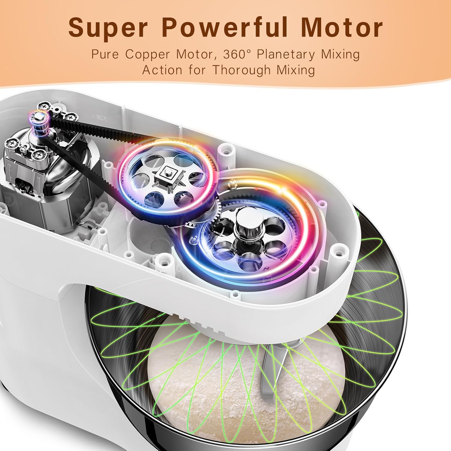 - Safe &Sturdy Bowl: Made of food-grade stainless steel, it ensures the health of the whole family; Large 4.8QT capacity meets daily kitchen requirements; The bowl can be fixed to the base, which makes it stay steady during mixing work; Considerable design of a handle will facilitate your operation; With suction cups on the bottom of the base, the kitchen mixer won’t move all over the counter
