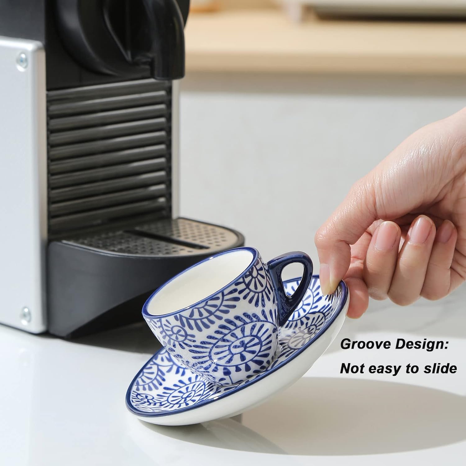- THICK CUPS AND PRACTICAL SAUCERS - The thick wall of cups will keep the espresso warm and retain the flavor, making every sip enjoyable. These saucers provide a place to put a tiny demitasse spoon and have grooves inside for the mug to sit perfectly without moving. Making you enjoy the coffee in an elegant way.