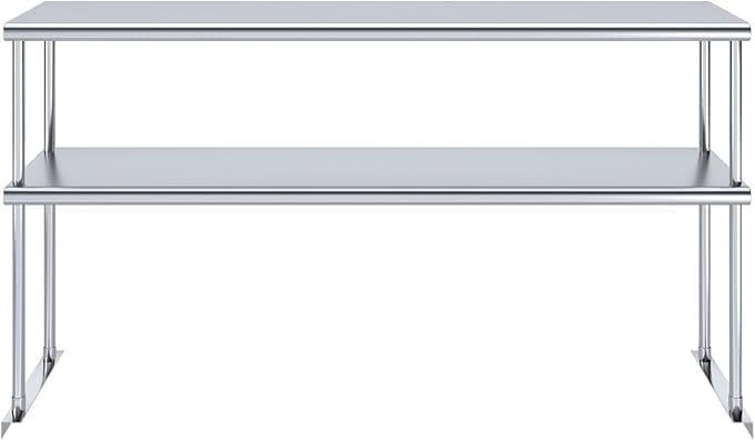 - This stainless steel double overshelves provide a stable and sanitary surface to store kitchen accessories, boxes, tools, cleaning equipment, and more. This NSF-certified table meets strict standards for public health protection and safety. The core structure of each overshelf is stainless, made of 18 Gauge galvanized steel, guaranteeing a lifetime of durability & reliability in the highest volume environments.
