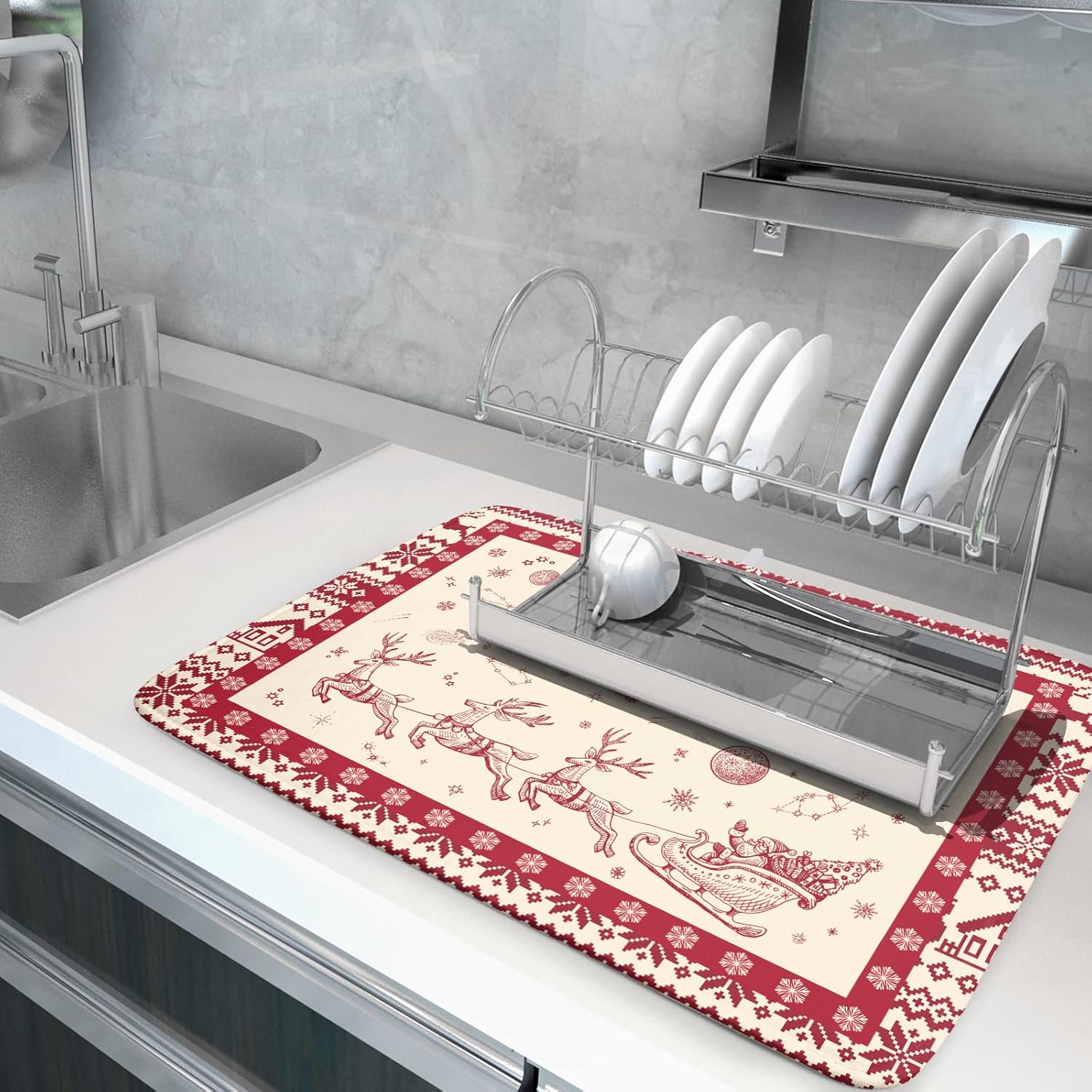 Christmas Moose Dish Drying Mat 18x24 for Winter Santa Claus Kitchen Counter Decor Absorbent Reversible Microfiber Deers Animal Dishes Pad Dish Drainer Rack Mats Kitchen Accessories