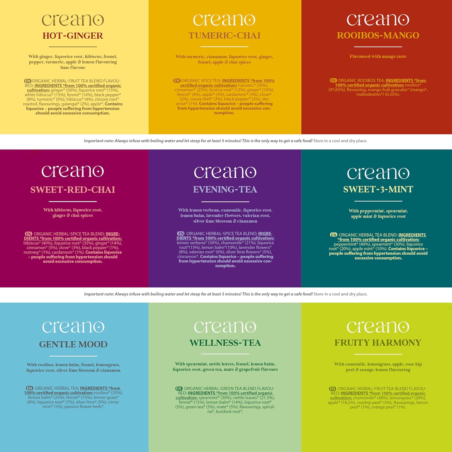 - Creano Organic Herbal Fruit Spice Tea Sampler "Organic Herbal Tea" is a unique blend of the different organic tea varieties: fruity chamomile, hot ginger, turmeric chai, rooibos mango, sweet red chai, evening tea, sweet mint, gentle mood and wellness tea; 100% organic, 9 x 3 tea bags