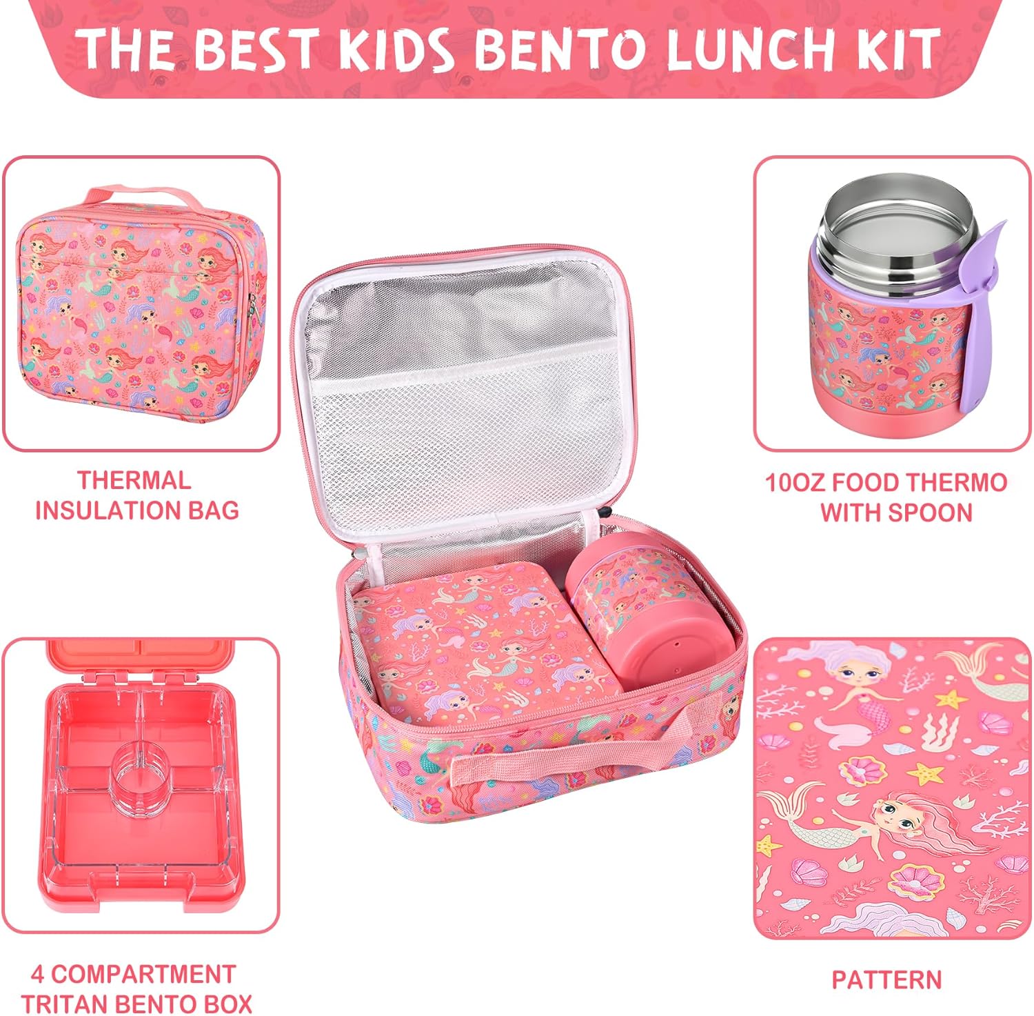Bento Lunch Box Set With 10oz Soup Thermo, Leak-proof Lunch Containers with 4 Compartment, Kids Hot Thermo Food Jar/Insulation Lunch Bag, Food Containers for School(Mermaid)
