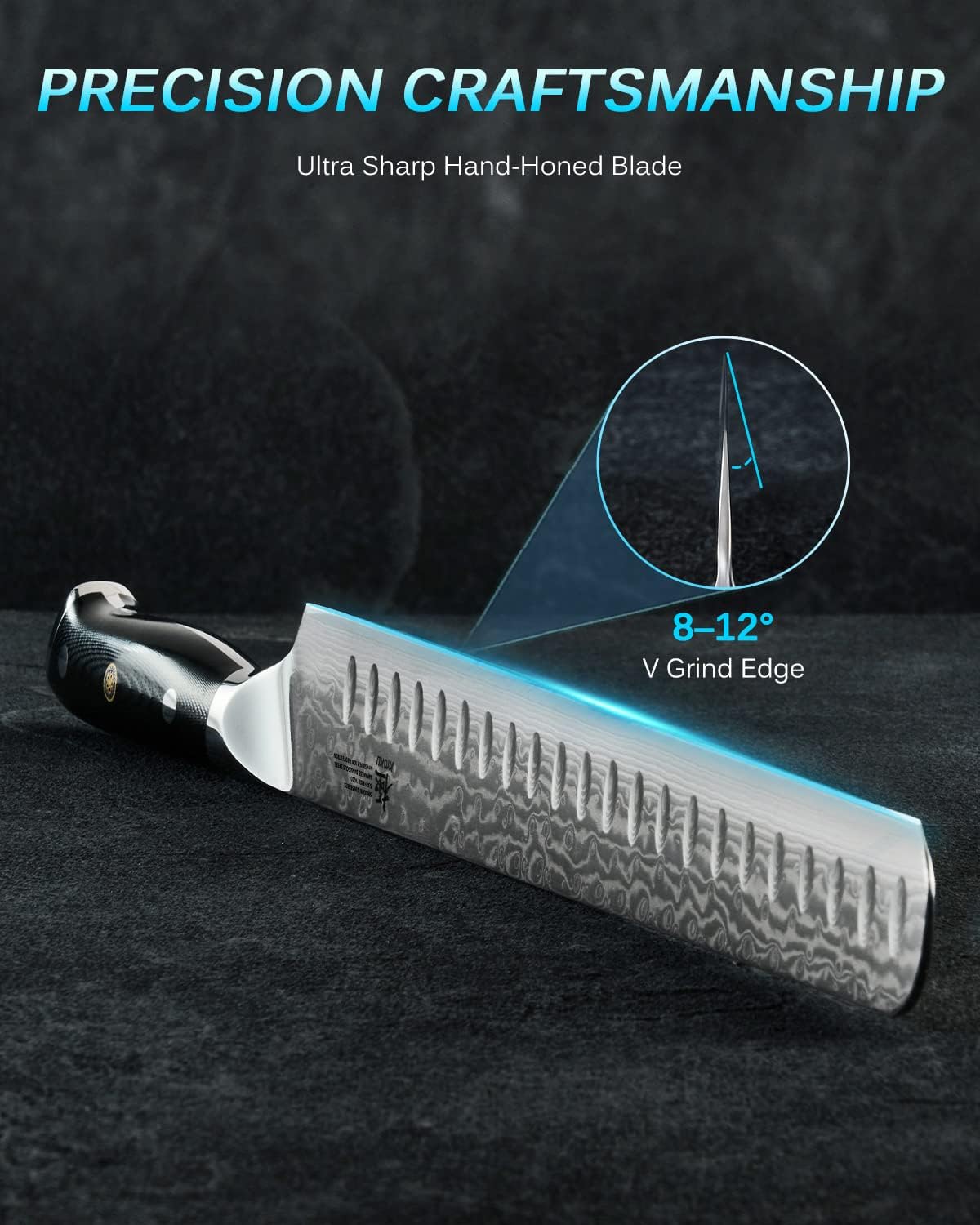 - ULTRA-SHARP BLADE: Sharpened to 8 to 12 degrees on each side using the traditional 3-step Honbazuke method, this carving knife's long blade and indentation are perfect for cutting even and thin slices through large cuts of meat, fruit, and vegetables
