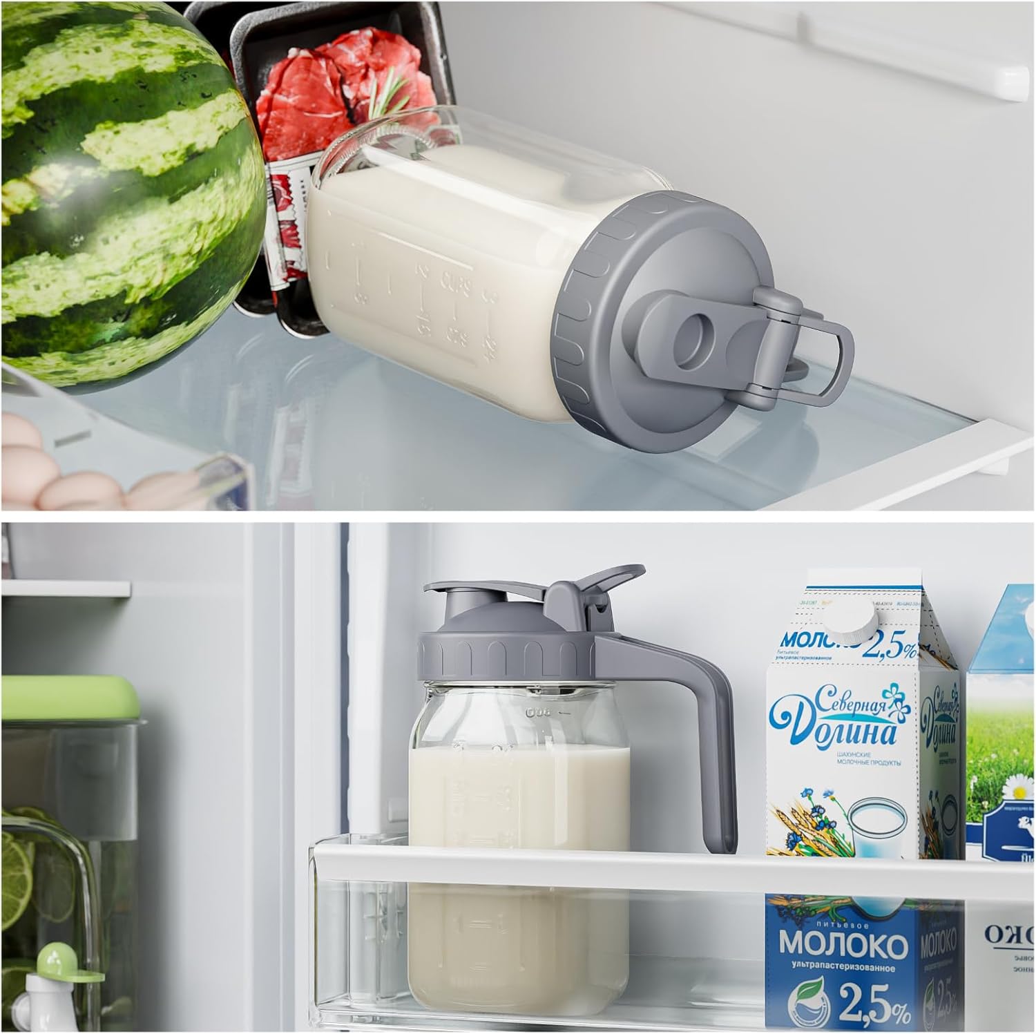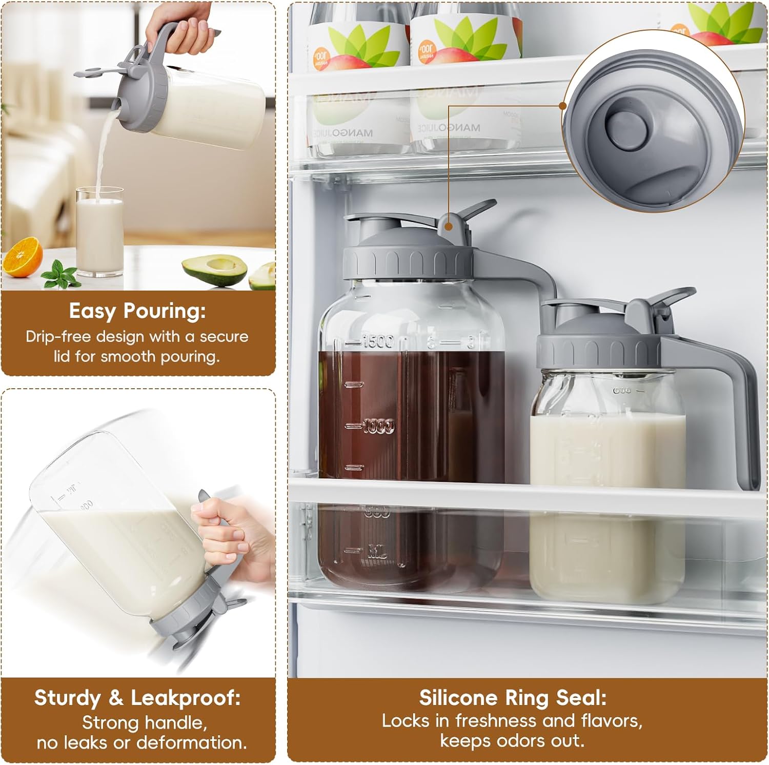 - 【Spout Sealed Lid with Handle】 - The 32oz jug with silicone seal in the pour spout lid, Leak proof and better maintain the freshness and taste of the beverage, avoid mixing the smell of other foods in the fridge. The flip-top lid is easy to pour and the jug is securely fastened to the lid