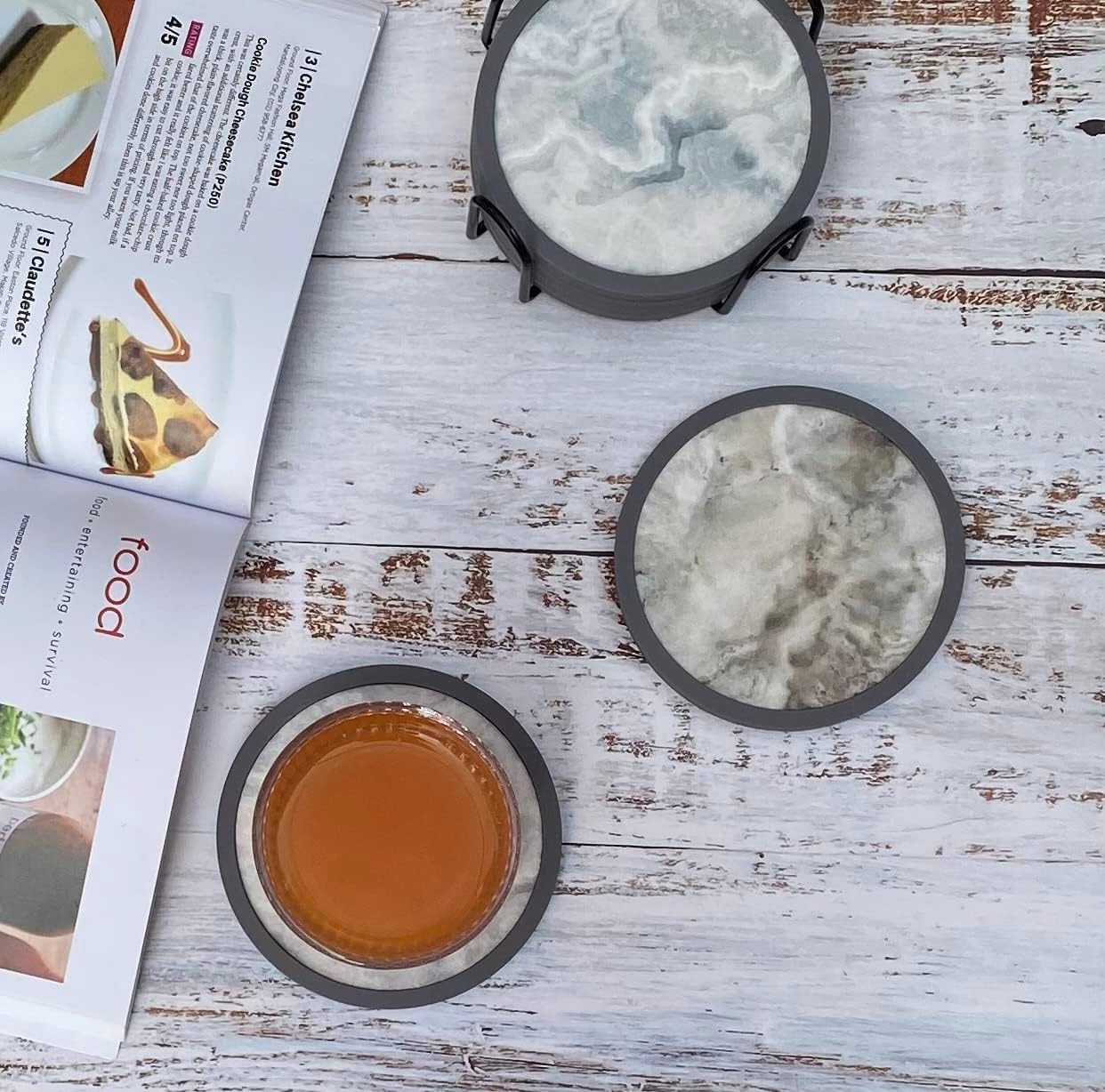 Absorbent Coasters for Drinks with Holder - 6packs, Silicone Coaster with Soft Felt Insert (4.3 inch Coasters with 4.5 inch Holder, Marble Style)