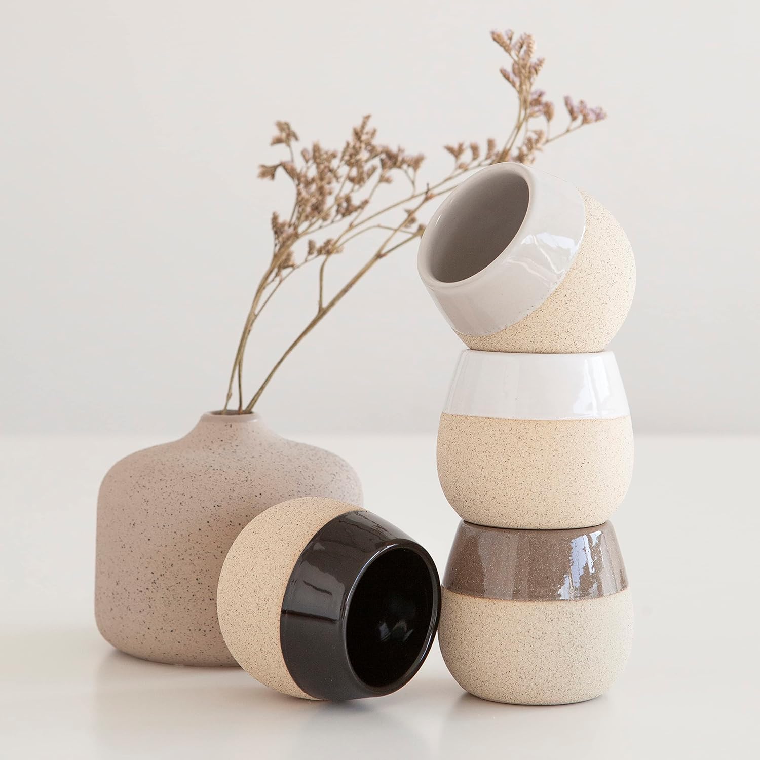 - A THING OF BEAUTY – Featuring a unique dual-textured design (glazed upper portion and rough/sandy lower portion), not only do these breathtaking demitasse cups look stunning but also feel great in your hands! Each set of these ceramic demitasse espresso cups includes a lovely color variant (white, black, grey & clear brown) combined with sandy beige.