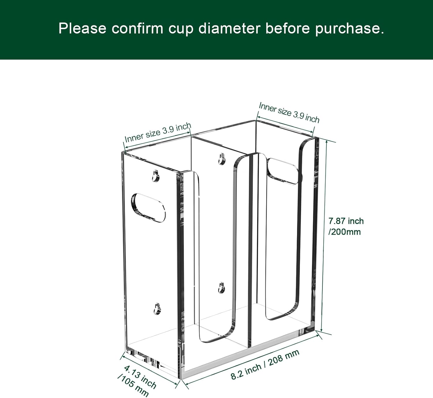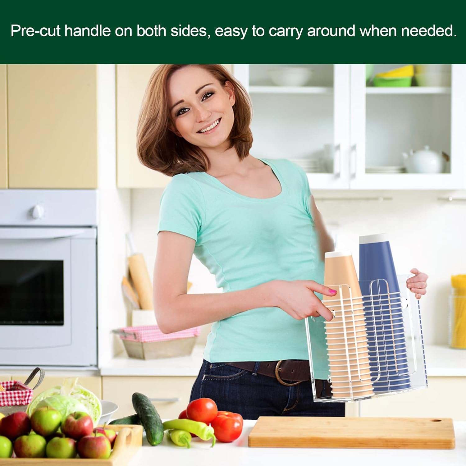 - Cup Dispenser with Handles on Both Sides - pre-drilled handles on side and holes on back, provides more possibilities, either mount it on wall of your kitchen or office, or let it stand along the side of your cabinet in the trailer, you make the decision.