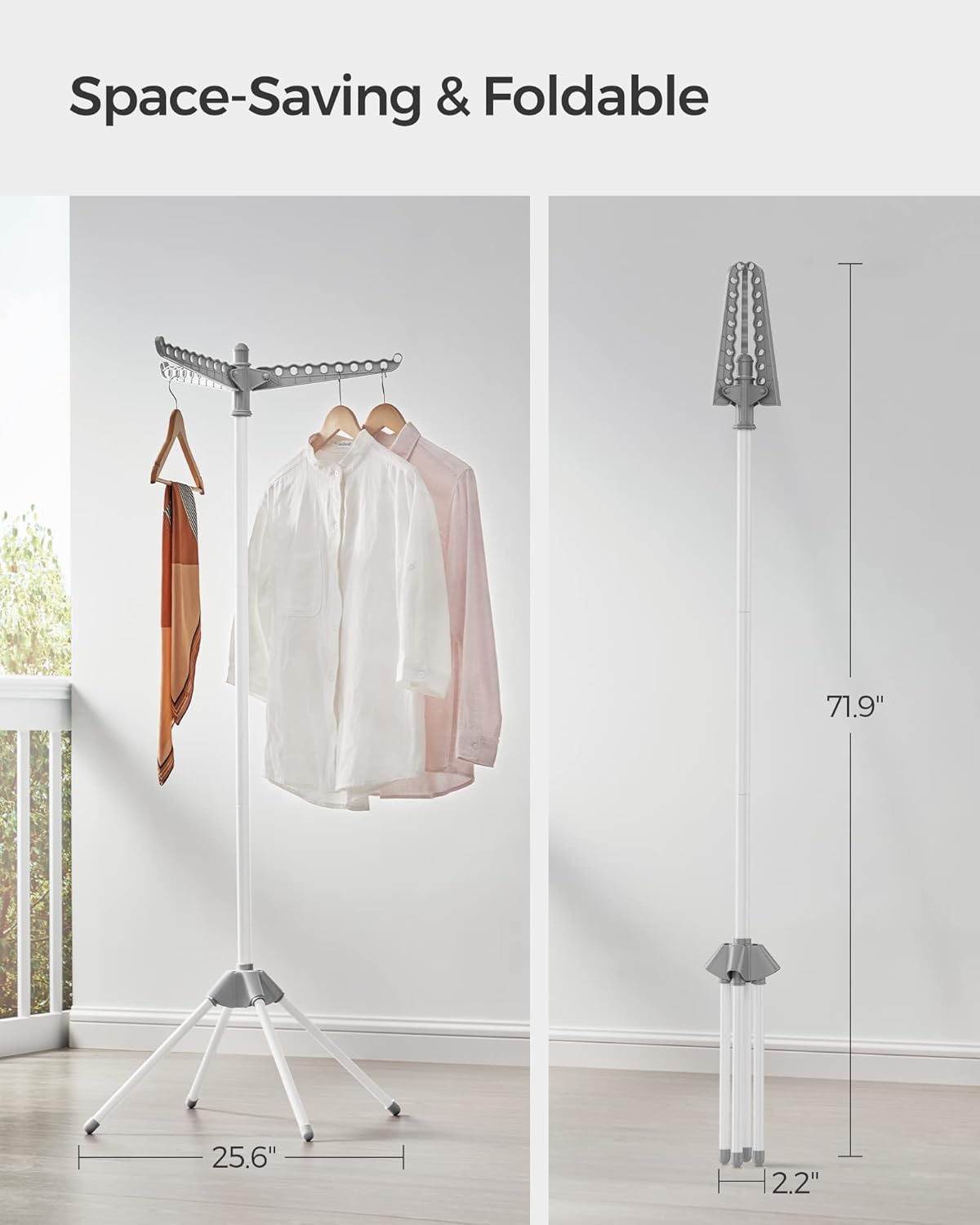 - [Foldable & Space-Saving] Standing at 25.6"D x 25.6"W x 59"H during use, this clothes drying rack takes up little space, perfect for small spaces. Fold the arms and legs into a small size of 2.2"D x 2.2"W x 71.9"H, it will stay out of the way after use