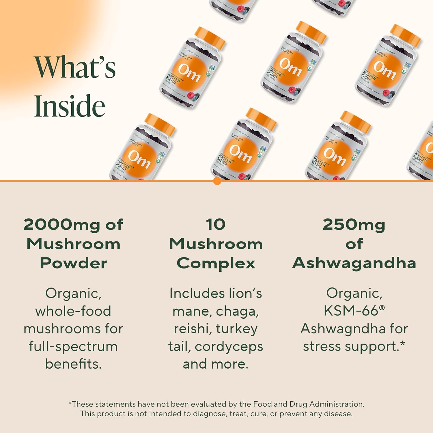 Om Master Blend Mushroom Gummies - Organic Mushroom Supplement with 10 Mushrooms and Ashwagandha – Support Immunity, Gut Health & Stress Relief, 56 Count (28 Servings), Mixed Berry Flavor