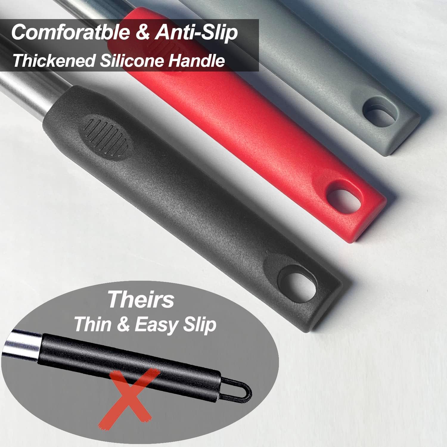 - More Comfortable Handle: Unlike other generics, we upgrade the handles; The stainless steel handle core is coated with thicker silicone, it is more durable, and isolate heat better; The profile is ergomonic designed and gives your better grip experience.