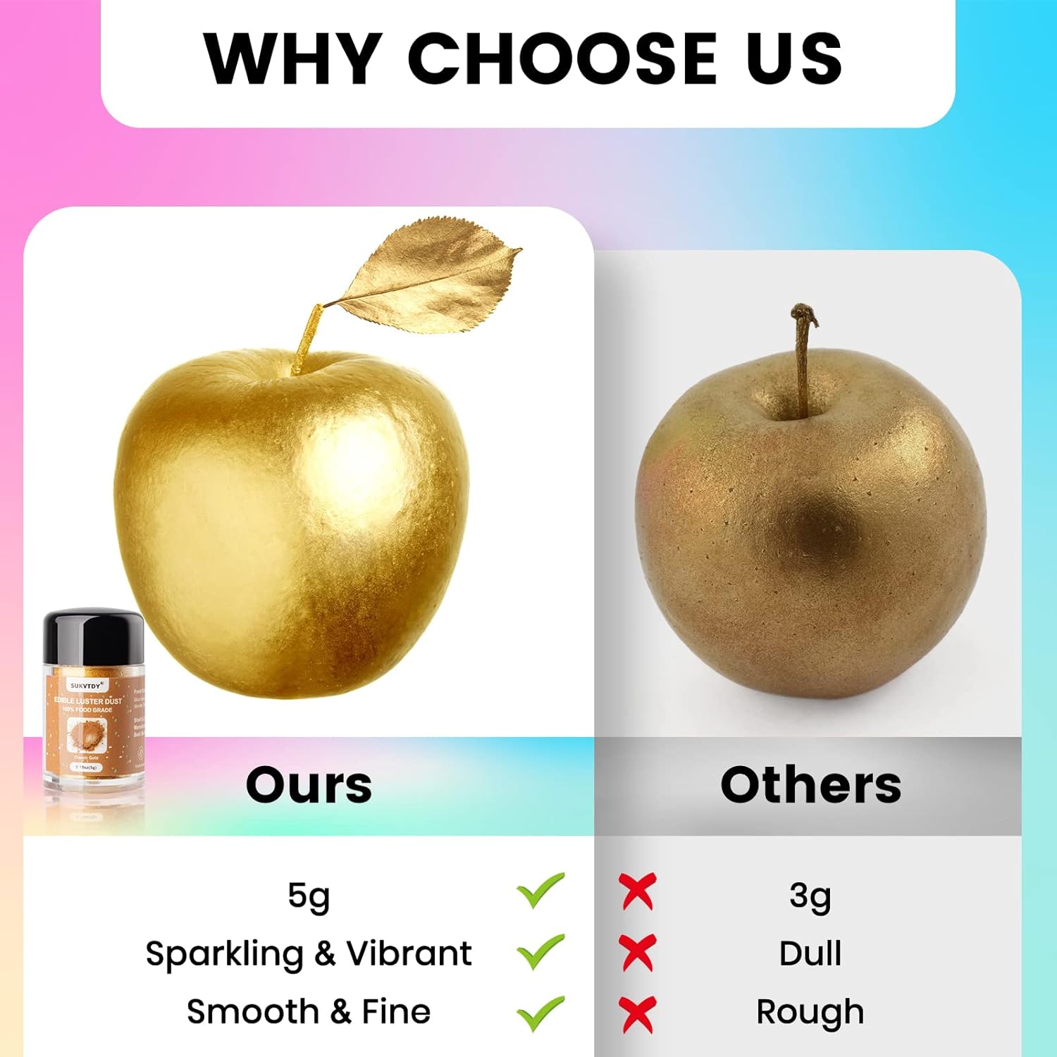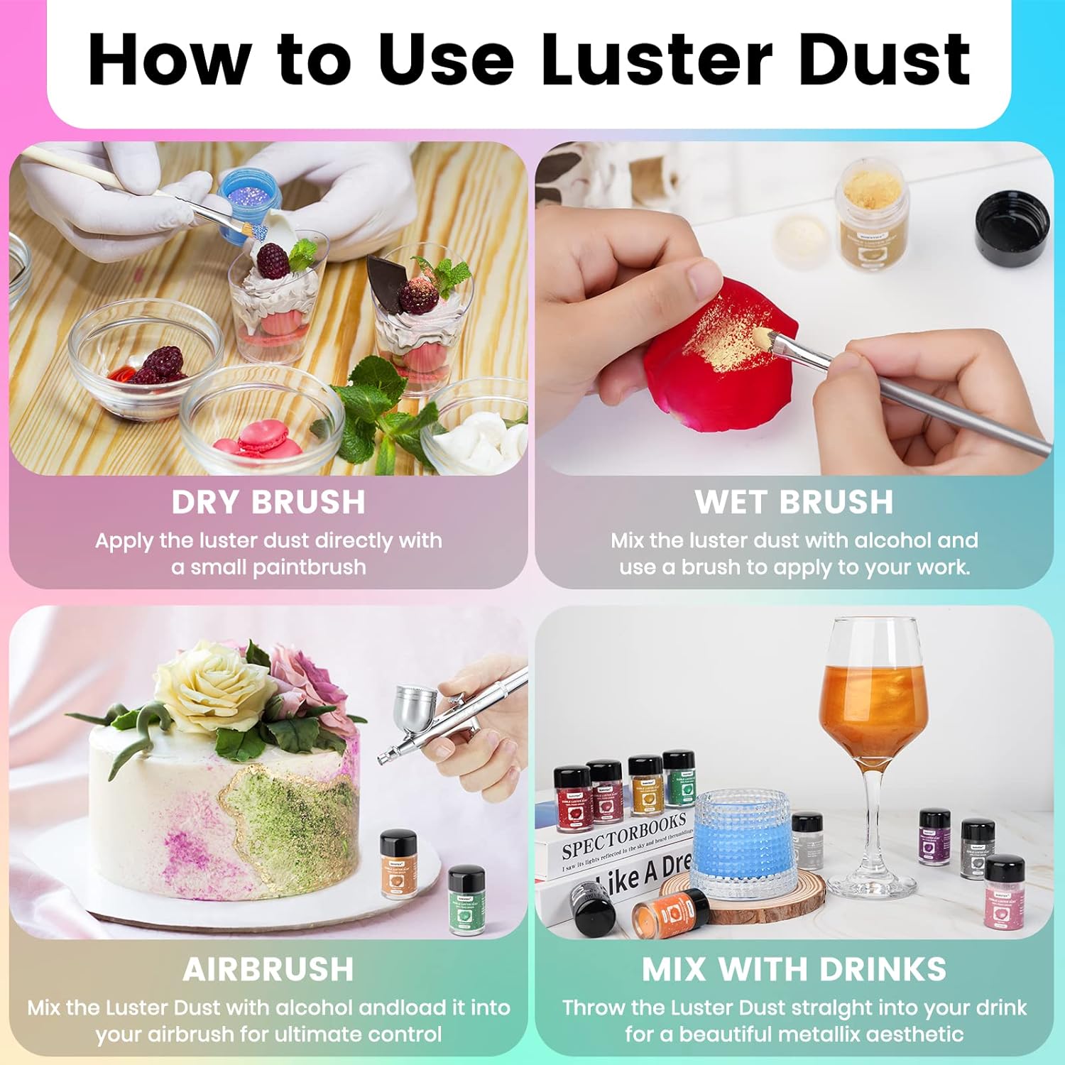 - Great for Baking and Drinking: Our edible glitter dust for cookies and backing widely used in various drinks, cocktails, vodka, beer etc. Luster Dust edible also nice for cake, chocolate, fondant, candy, cookies, cupcake and more. Please enjoy the fun of DIY desserts and drinks.