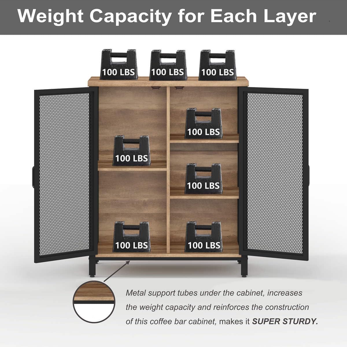 - Not Wobbles: Thanks to heavy duty metal frame and support leg under bottom shelf, the coffee bar table stands quit stable. We also provide anti-tip device, you can mount this bar cabinet to the wall to avoid unexpected tipping. 4pcs pre-assembled plastic pads avoids your wood floor from scratching.