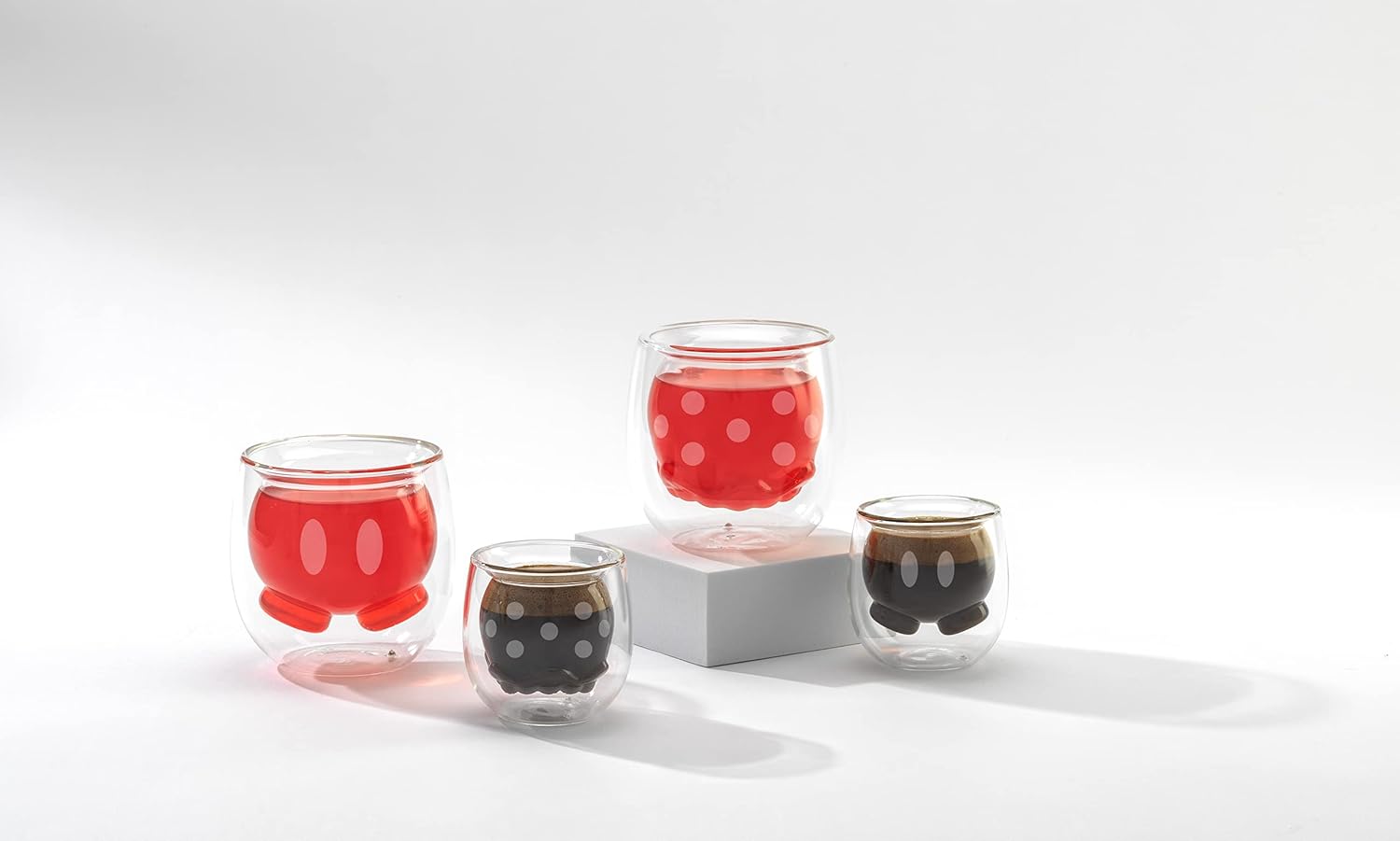 JoyJolt Mickey Pants and Minnie Skirt 3D 2oz Espresso Cups. Double Walled Espresso Glasses (2pc) Small Double Wall Glass Coffee Cups. Demitasse Cups, Espresso Measuring Cup or Liqueur Shot Glasses