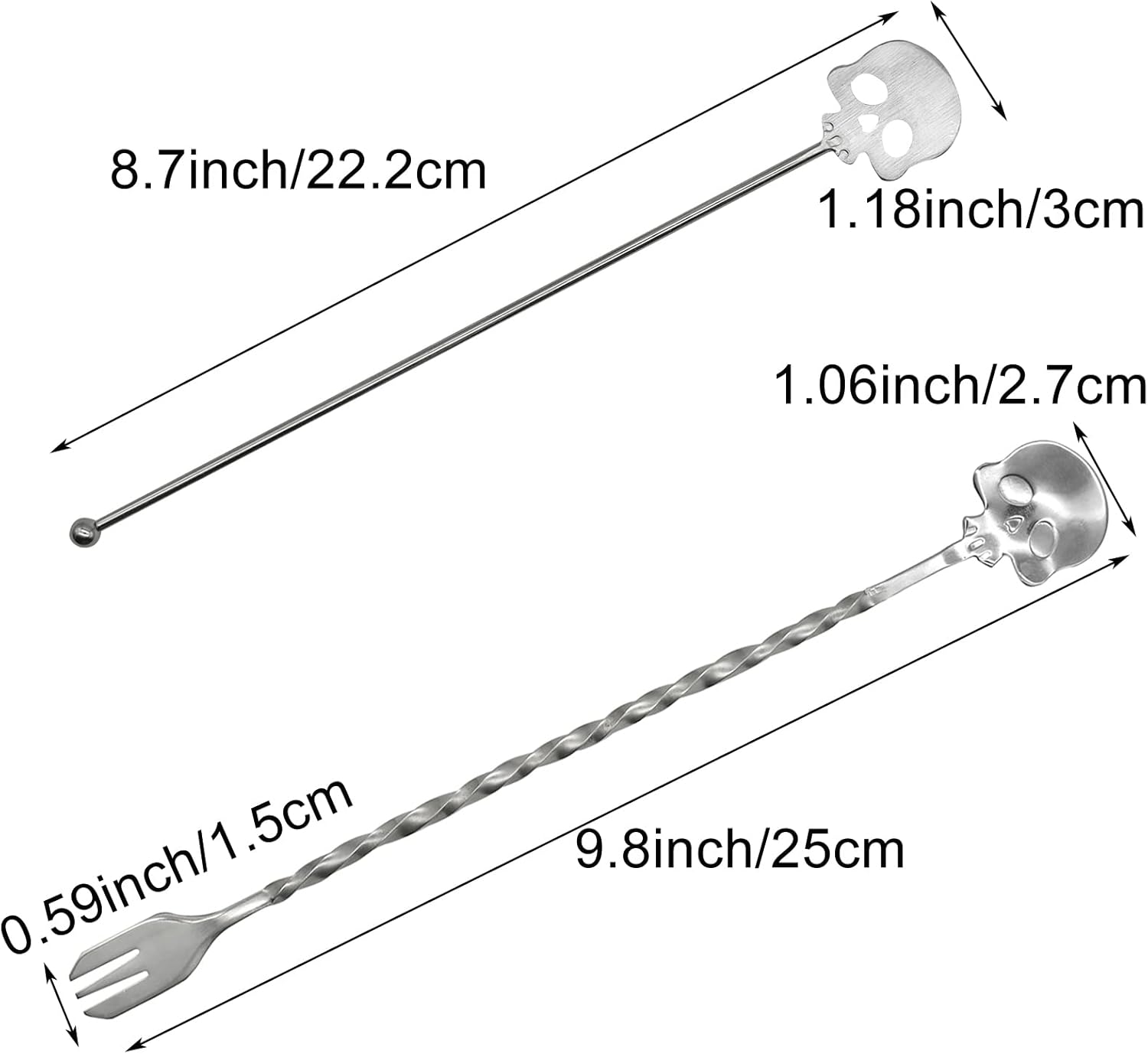 - 【Package】Pack of 4, 2 pieces stir sticks and 2 piece cocktail spoon with skull head pattern, color: silver