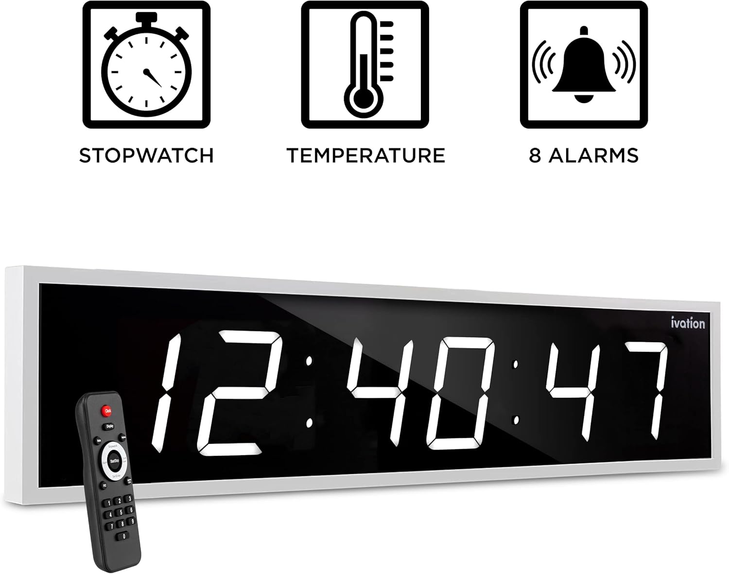 Ivation Huge Oversized 72" Large Digital LED Clock | Big Digital Clock w/Multi-Function Display – Stopwatch, Timer, Alarms, Temp & Date | 6 Brightness Levels, Time Memory & Remote (White)