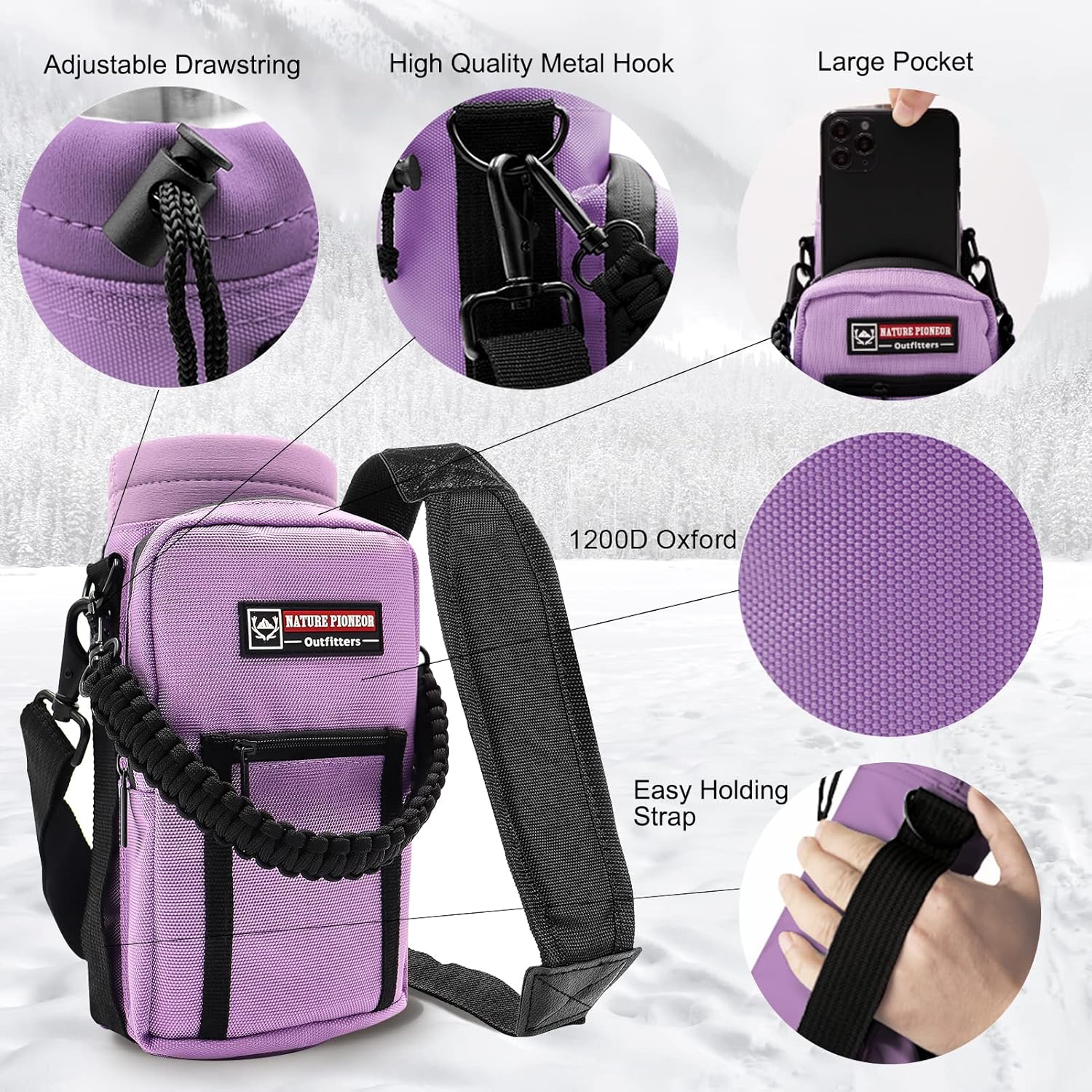 - 【Portable Water Bottle Holder】 – To make carrying easier, this water bottle comes with a handmade paracord handle and adjustable shoulder strap for hands-free convenience. The holder includes a zippered storage pocket for small items like keys, cards, or snacks, and a side hook for accessories. Whether you’re going on long hikes, outdoor adventures, or traveling, this bottle + carrier set offers both functionality and style