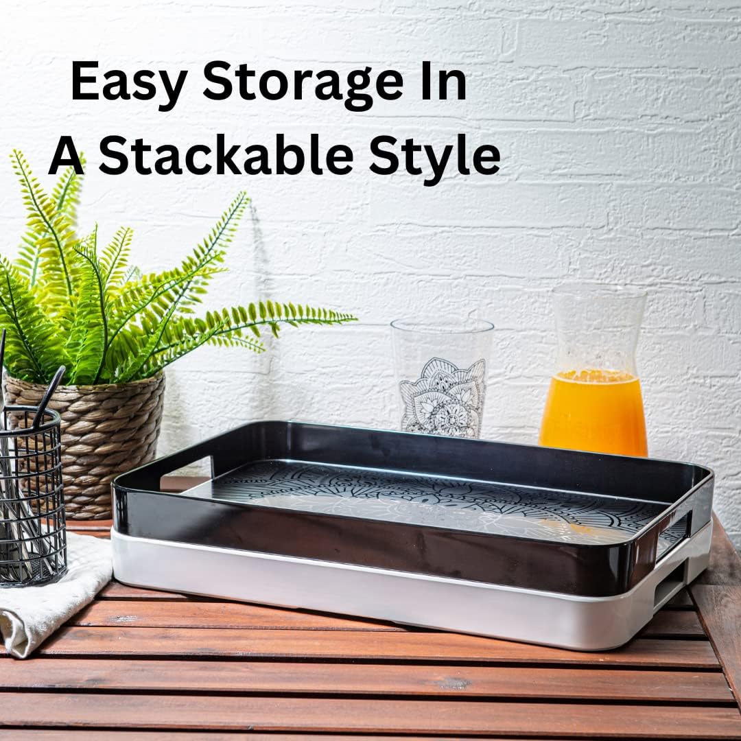 - HANDLES DESIGN - The rounded handle allows you to push or pull the tray easily, so the tray can be handled steadily from one place to another. The large cut-out handles design allows you to grip the tray stably and not slip off. A modern and simple appearance with a smooth edge design is the necessary choice for your home.