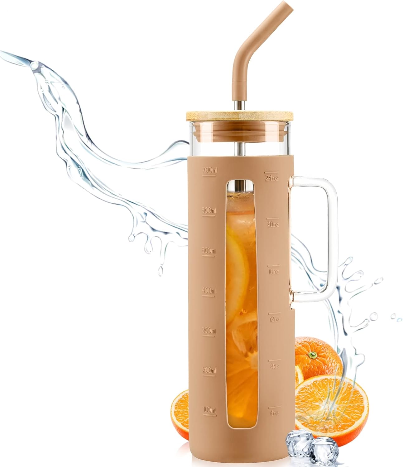 Kodrine Tumbler with Lid and Straw, 24 oz Glass Tumbler with Handle, Iced Coffee Cup Boba Smoothie Cup, Coffee Tumbler Water Tumbler Cups with Bamboo Lid Home Office Tumblers, Amber