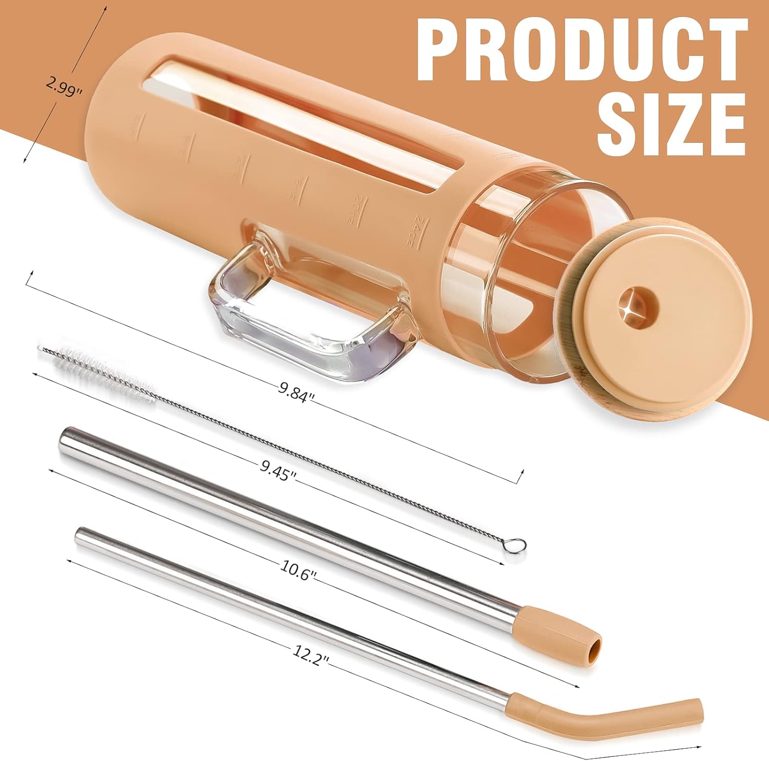 - WHAT'S IN THE BOX - The Tumbler Set contains a 24 oz smoothie cup covered with a silicone protective sleeve, 1 bamboo lid, 2 stainless steel straws with silicone tips, 1 straw cleaning brush. The boba straw is a wider straw that is specifically designed for drinking bubble tea or other beverages with larger pearls or fruit chunks. The slim straw is a narrower straw that is typically used for sipping drinks such as iced coffee, water, juice, or soda.