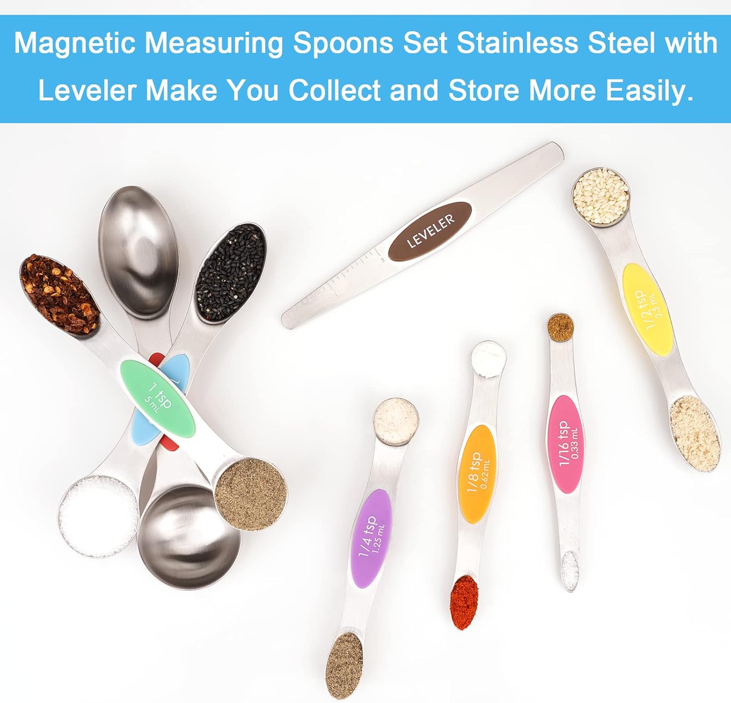 - 【Well-Designed 8-Piece Set】The Magnetic tablespoon set contains 7 metal measuring spoons: 1/16 tsp, 1/8 tsp, 1/4 tsp, 1/2 tsp, 1 tsp, 1/ 2 tbsp, 1 tbsp, and 1 scraper. Dual sided: The oval end is narrow to fit into most spice jars. The round end is perfect for liquids. These stainless measuring spoons are great for measuring spice, sugar, salt, oil, coffee, wheat etc. Make your cooking and baking easier and more fun.