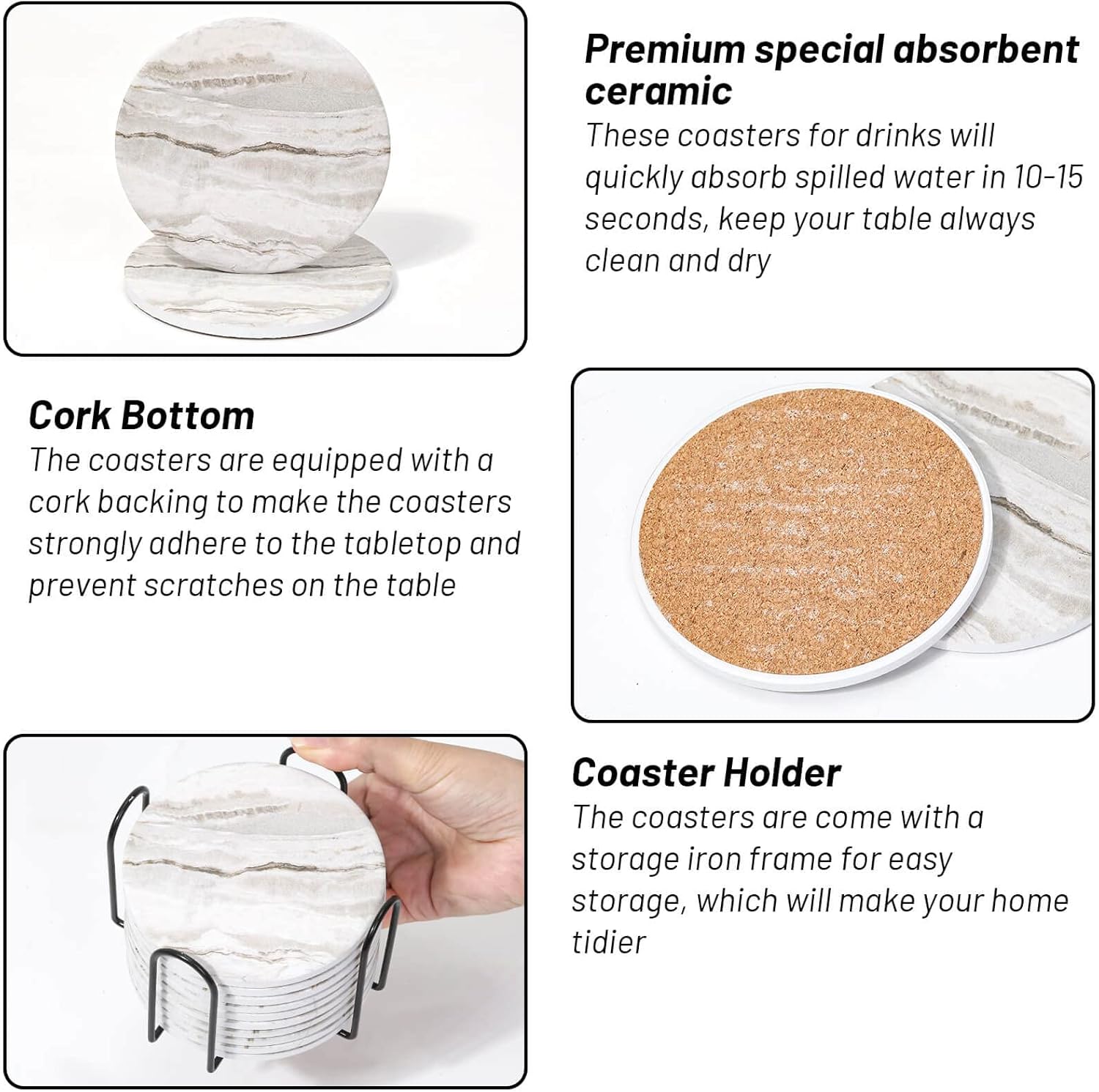 - Package including: Our drink coasters set includes 10 pieces of ceramic coasters and a metal holder. Gray marbling design is suitable for home decoration. The coaster holder makes the coasters convenient for storage.