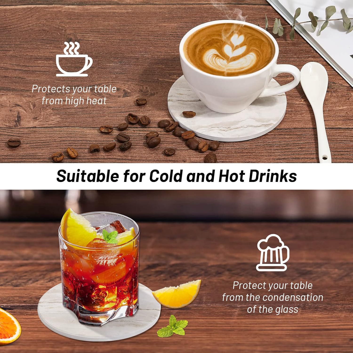 - Decorative Coasters: These marble appearance cup coasters are great to decorate your kitchen, living room, bedroom or office. With our absorbent coasters, you don't worry about the drink drip and dirty your favorite table. You can enjoy a good time with your family or friend together.