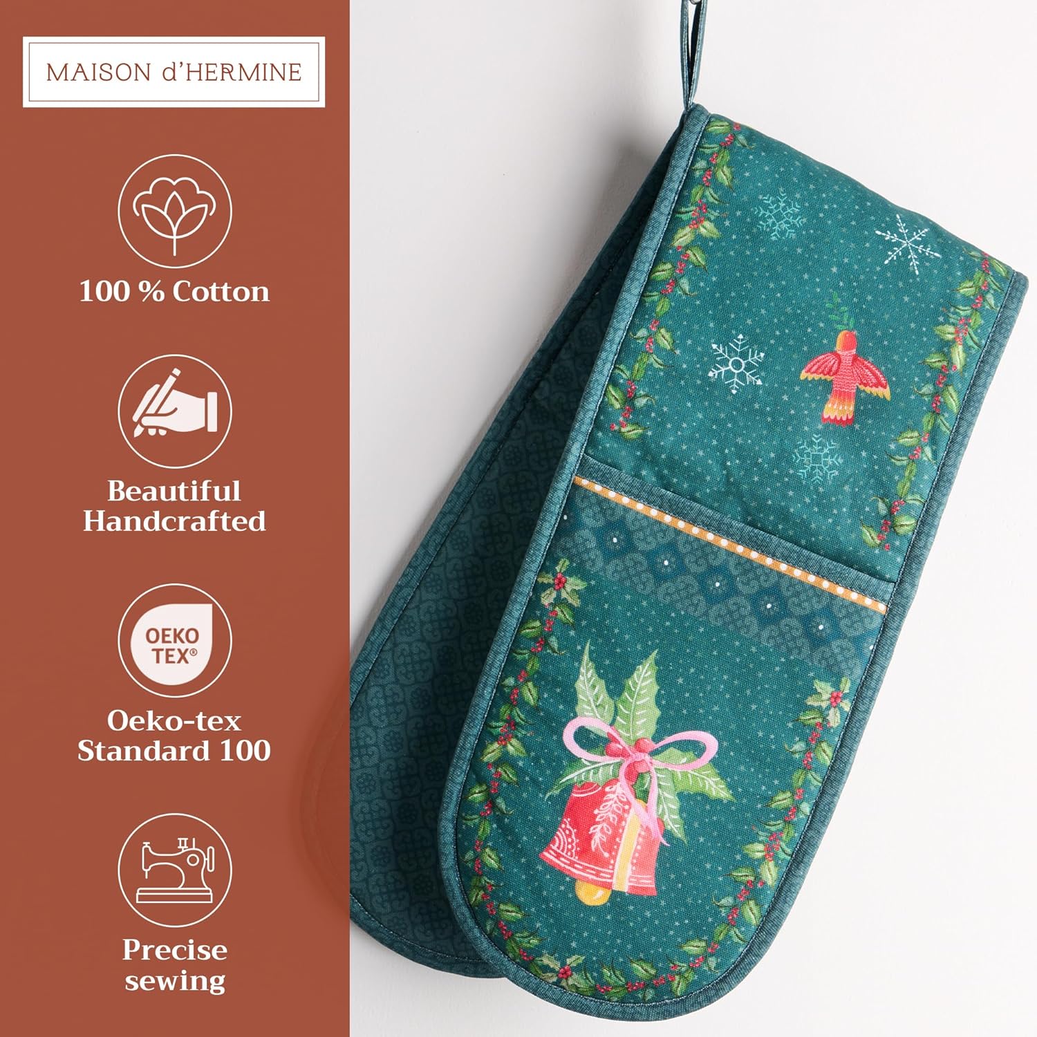 Maison d' Hermine Double Oven Mitts 100% Cotton 7"x35" Double Oven Mitt Heat Resistant BBQ Cooking Gloves with Loop, Baking, Grilling, Home, Kitchen, Handling Hot Pans (Hygge Christmas)