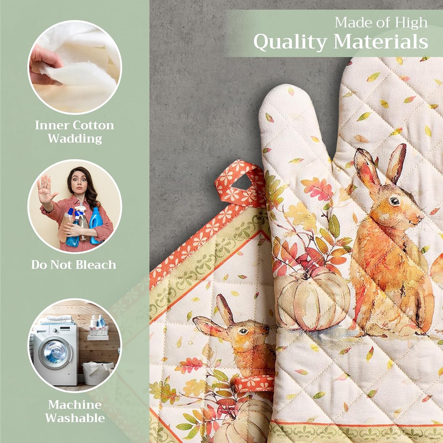 Maison d' Hermine 100% Cotton Oven Mitt & Pot Holder Set (7.5"x13" & 8"x8") Heat Resistant BBQ Cooking Gloves with Loop, Baking, Grilling, Kitchen, Handling Hot Pans (Pumpkin Passion)