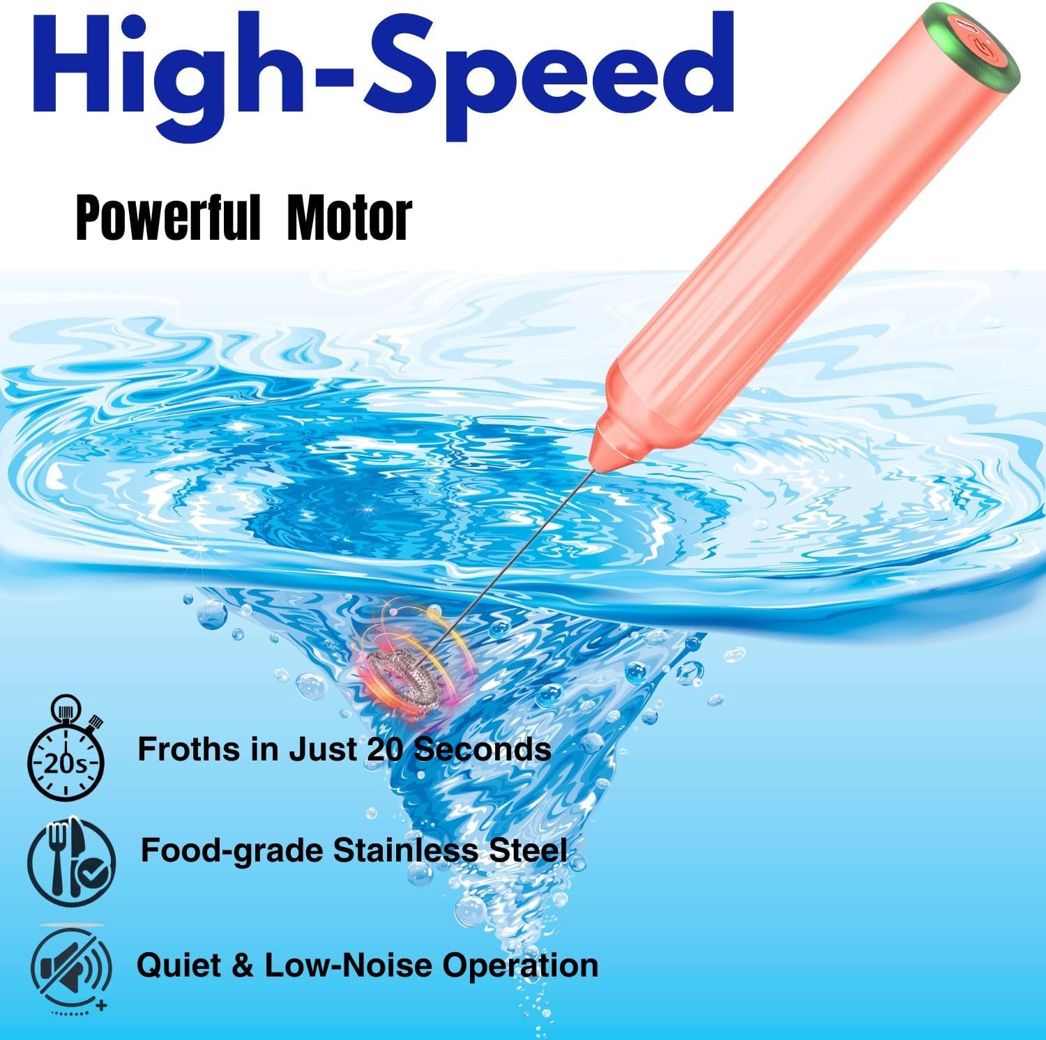 Milk Frother Handheld with 3 Stainless Steel Whisks, Rechargeable Electric Drink Mixer with Stand & Travel Case, Milk Foamer for Coffee, Latte, Cappuccino, Hot Chocolate, Egg,Jam Supplement-Pink