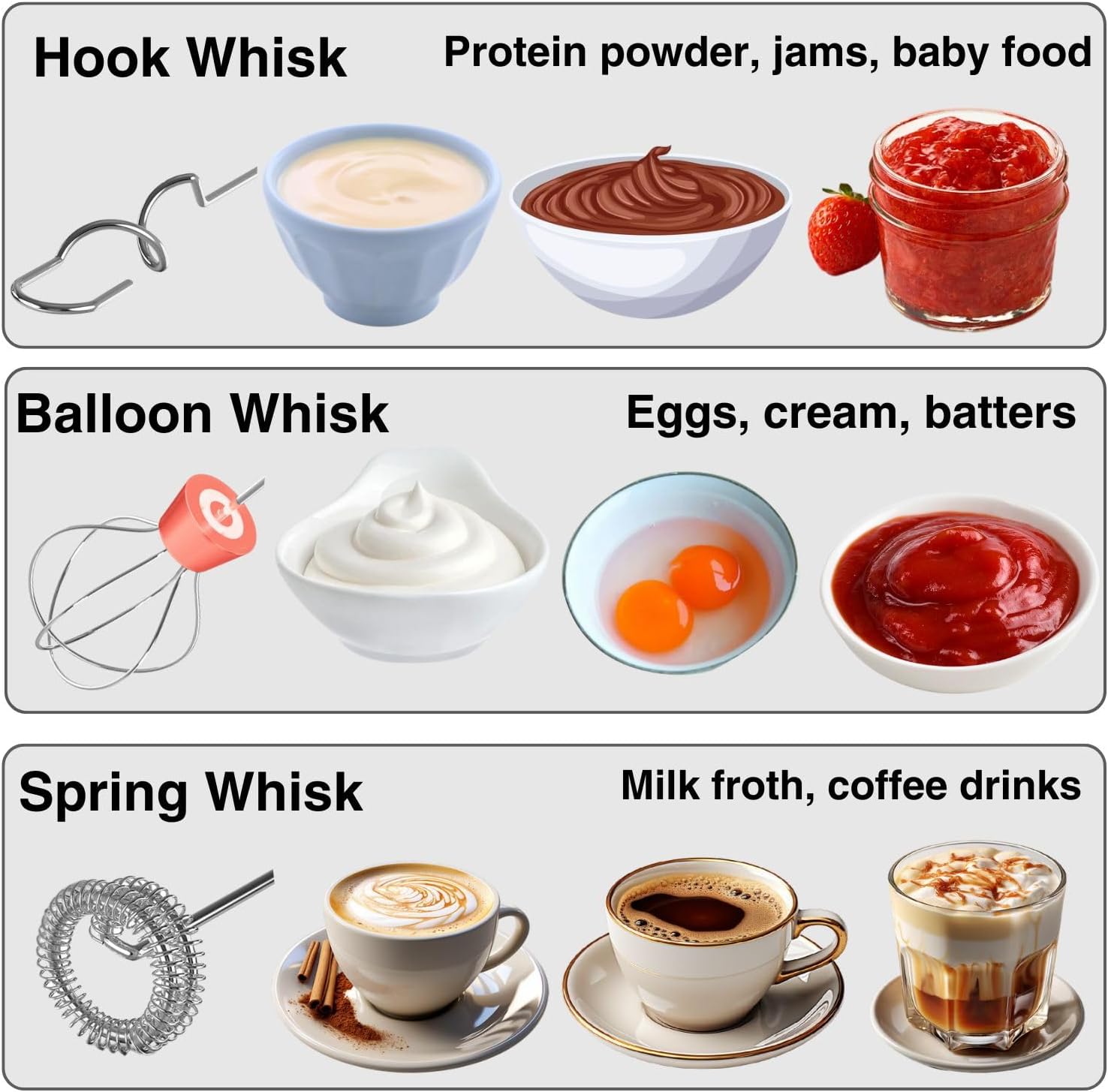 - 【3 stainless steel whisks for various uses】 This foamer comes with 3 detachable whisks made of premium stainless steel, which are durable and easy to clean. You can use the balloon whisk for eggs, the spiral whisk for milk froth and the third whisk for jam supplement. Just rinse them under water after use and store them in the EVA storage bag.