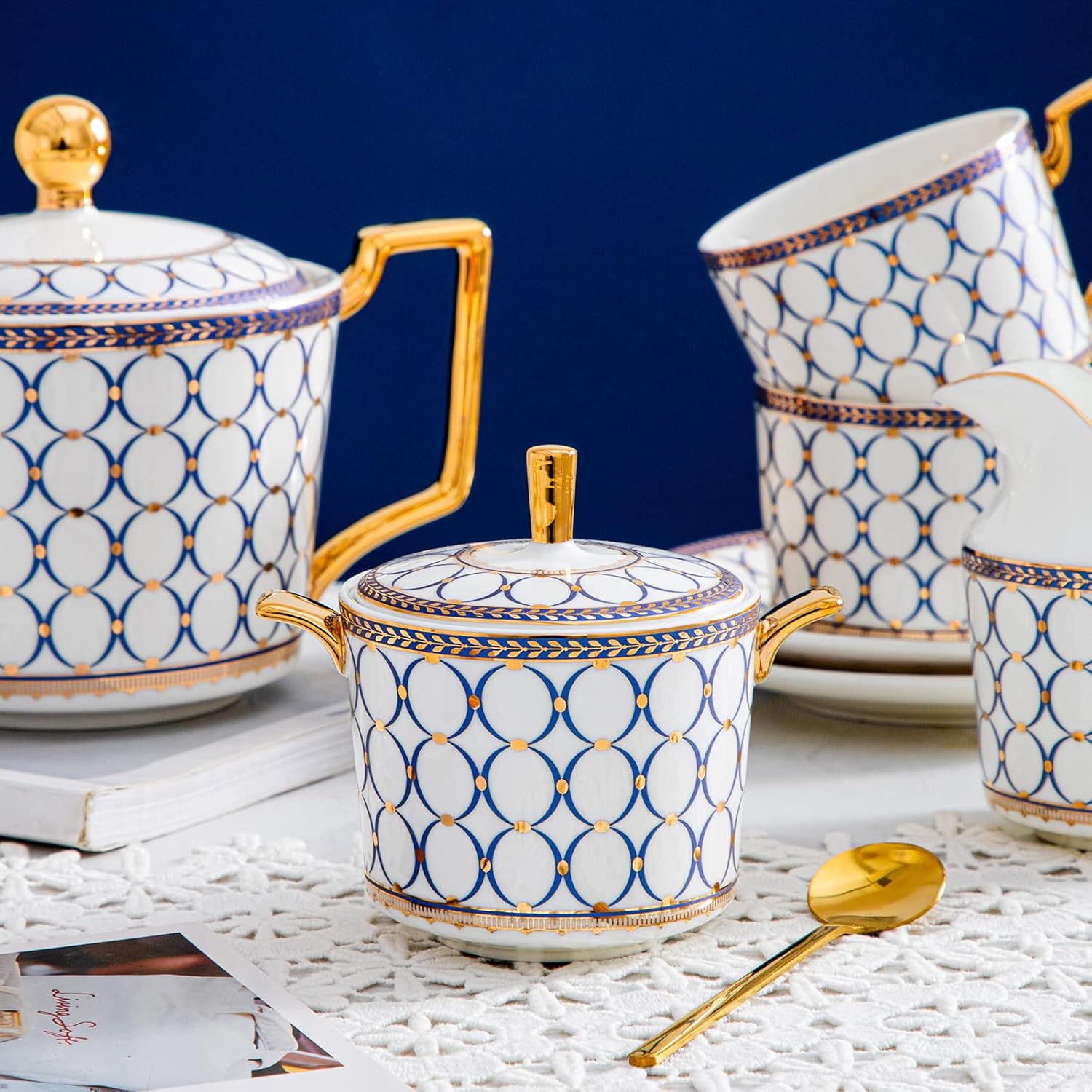 - 【Material】: The tea set is made of high quality and delicate cow bone powder and porcelain special clay, a natural material that does not contain any lead. Up to 45% cow bone powder content makes this real bone china tea set to look clear and delicate, and sound crisp and clear.
