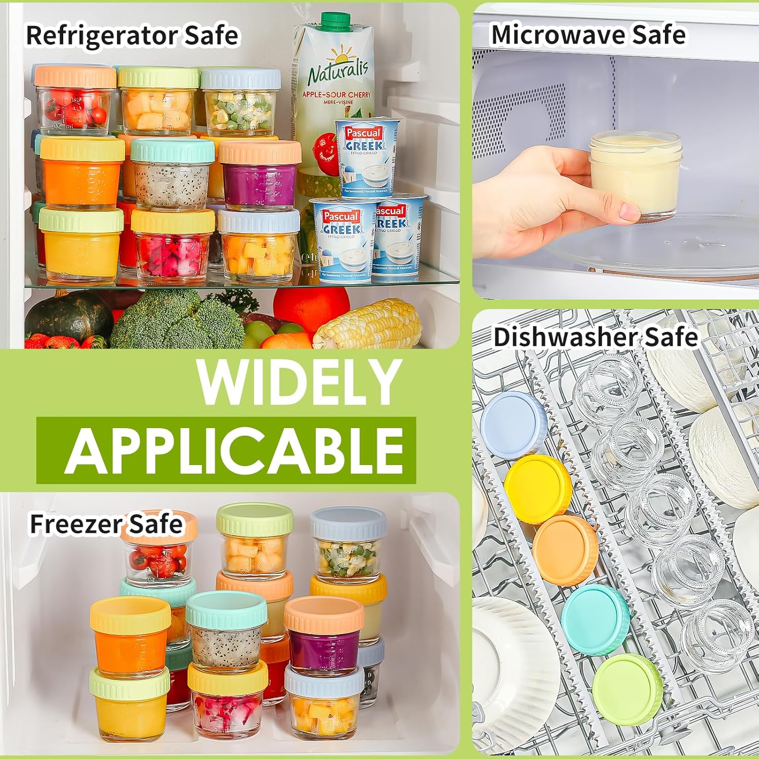 - 🌽STREAMLINED & SAFE FOR MOMS: These convenient glass baby food jars make food preparation, storage, and use easy. Just take them out of the freezer and pop them in the microwave to heat. (Always follow our guidelines for safe heating.) Cleanup's a breeze with a dishwasher-friendly design. For busy parents, it's about less fuss and more precious moments with your little one.