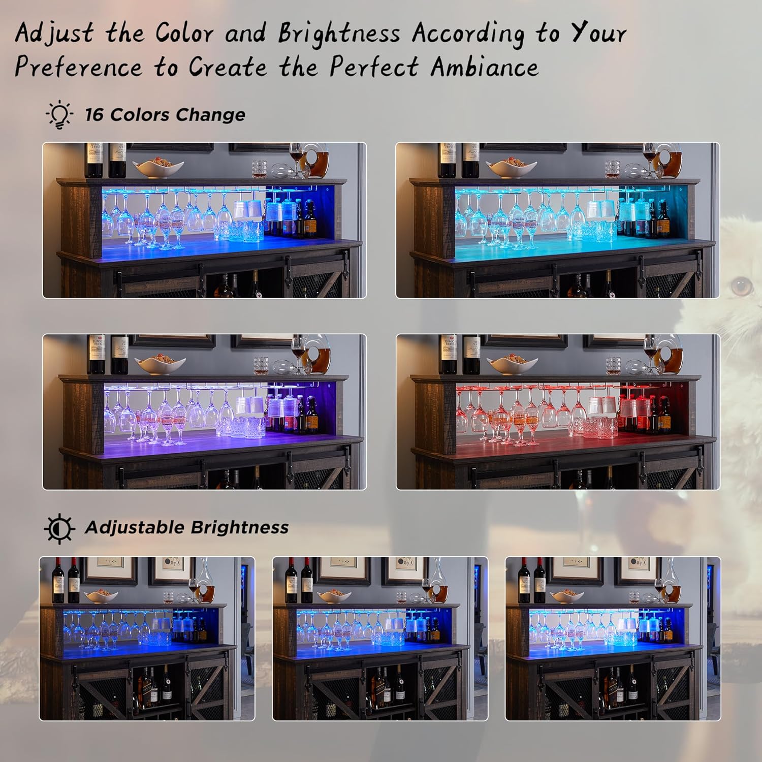 - Bar Cabinet With LED Lights: As home bar cabinet, is equipped with an RGB LED light strip with 16 colors, 4 flashing modes, and brightness adjustment function to make the wine cabinet look so fancy and create a relaxing and cheerful ambiance in the room which is perfect for wine tasting, parties, and showcasing wine collection. With a soft glow that illuminates the stemware and wine bottles below, you can effortlessly locate and retrieve the desired bottle without fumbling in the dark