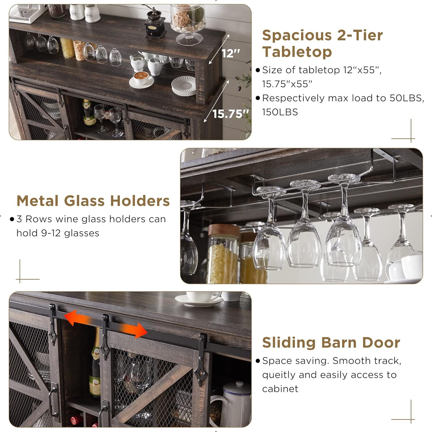 - Ample Storage Space: Spacious 2-tier tabletops(12"D and 15.75"D) perfect to hold your coffee maker and organize coffee beans, cups, jars, etc. Bottom 2 closed cabinets feature adjustable shelves, which can customize to store different size items. 3-row glass holders for 9-12 glasses and 15-grid wine racks easy to keep your wine stored in an ordered way. The powerful storage capacity of this cabinet ensure that everything you need for your coffee rituals is well-organized. Enjoy your leisure time