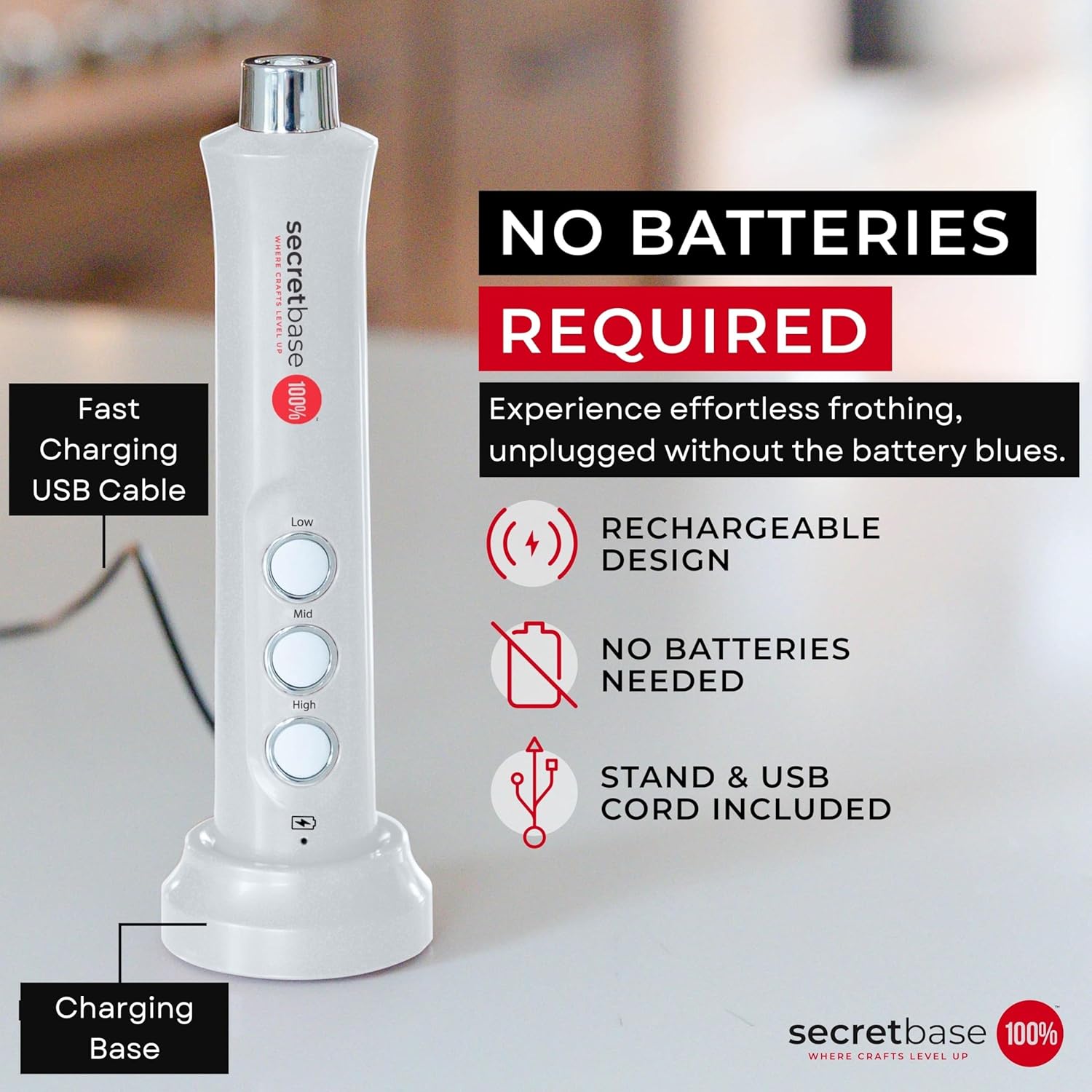 Secretbase 3 Speed Rechargeable Milk Frother, Pitcher, Charging Base - Handheld Mixer for Latte, Drinks, Matcha - Includes Cup, Electric Stirrer, Double-Whisk Frother for Coffee, Egg Beater (White)