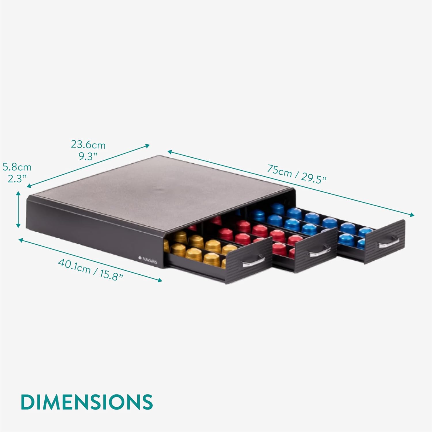 - STORE AND ORGANIZE: Keep coffee pods neat and tidy with this 50 capsule holder. The organizer tray stores 5 rows of standard-sized coffee and espresso pods (max. size 1 5/8" x 1 5/8"), for example those compatible with Nespresso machines.